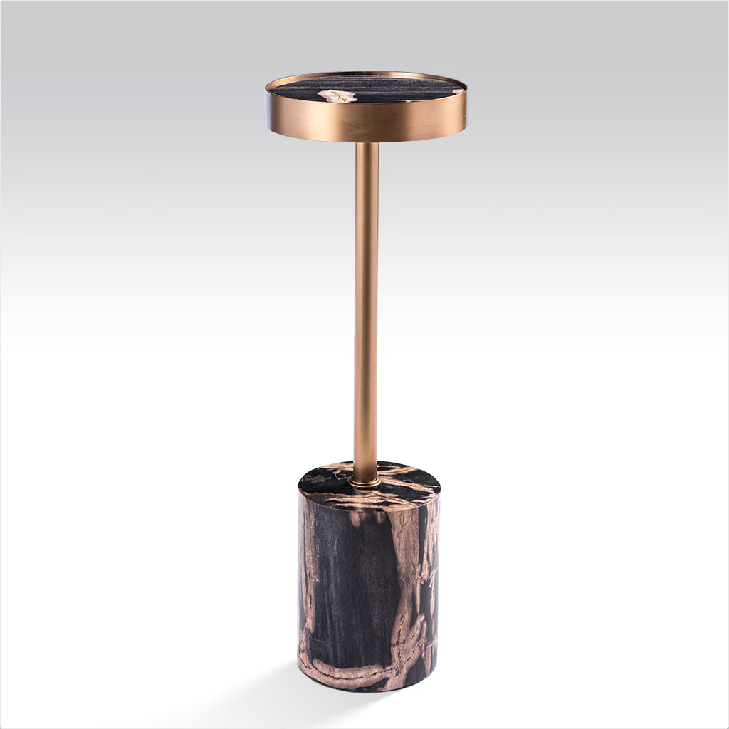 Cette table basse polyvalente est dotée d'un plateau et d'une base en bois pétrifié luxueux et durable, ainsi que d'élégants détails en acier inoxydable avec une superbe finition laiton. Sa forme ronde et sa base cylindrique lui confèrent une touche d'élégance moderne. Chaque pièce de bois pétrifié étant naturellement différente, chaque table sera unique.