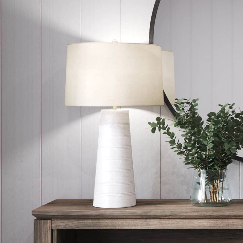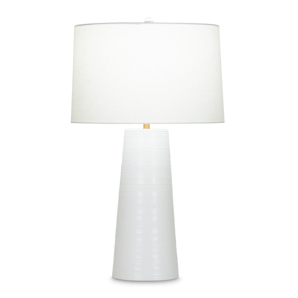 La lampe Annabelle est neutre et organique, s'adaptant à de nombreux styles de décoration. Son corps fuselé en verre soufflé bouche est texturé et présente une finition sculptée. L'abat-jour en lin blanc cassé est surmonté d'un fleuron en cristal et d'accessoires en laiton.