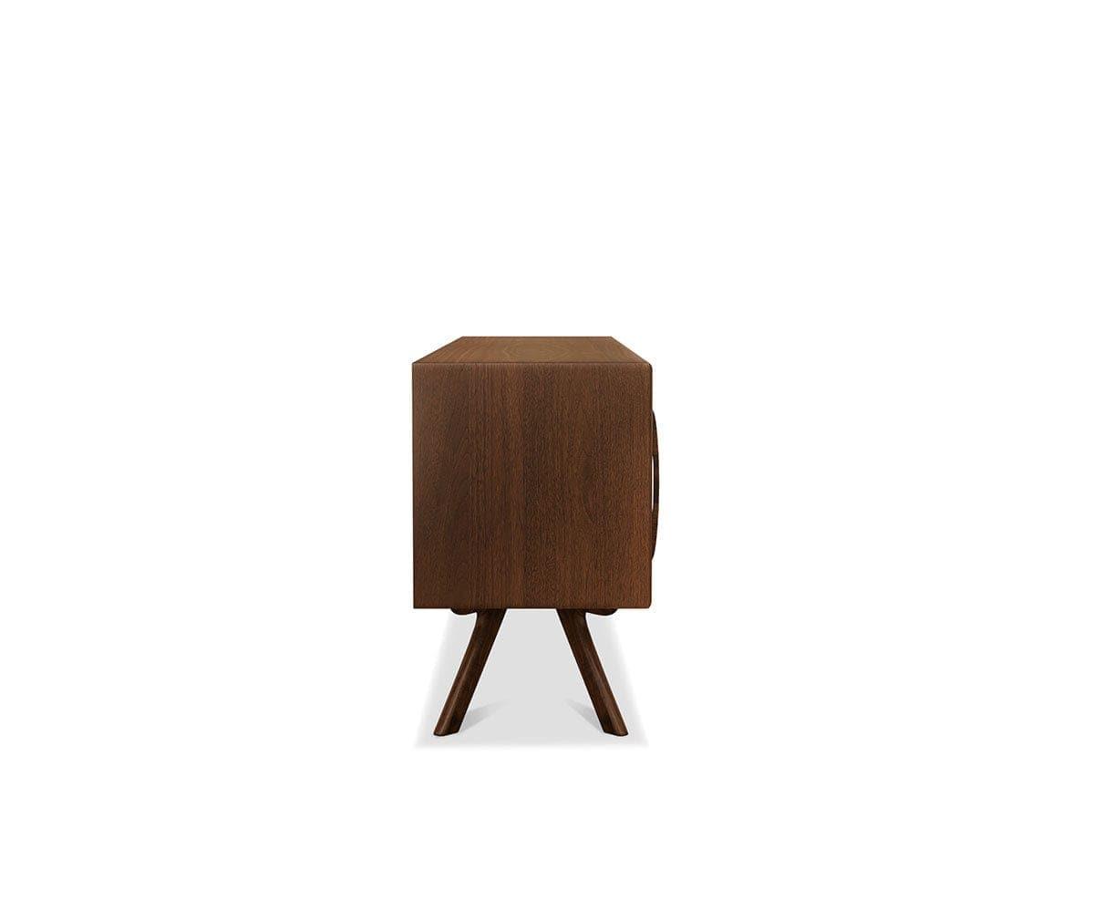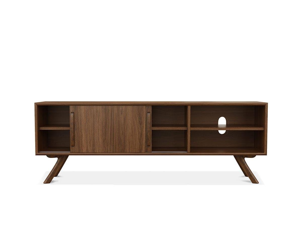 Le meuble multimédia Ardal allie avec élégance style milieu du siècle une forme expressive à une fonctionnalité pratique. Ses pieds en hêtre massif, teintés noyer chaleureux, présentent des angles arrondis qui insufflent vie et mouvement à toute pièce. Le meuble est doté de poignées en noyer massif et d'un vaste espace de rangement : d'un côté, deux compartiments ouverts avec des découpes passe-câbles accueillent vos divers équipements multimédia. De l'autre côté, des portes coulissantes vous permettent de ranger vos accessoires de salon ou vos appareils multimédia.