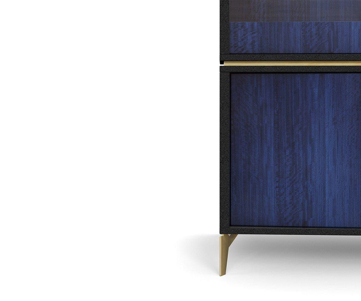 Le buffet Azzuro 2 portes apporte un style Art déco saisissant à votre intérieur. Sa façade cobalt éclatante à la finition brillante évoque des pierres précieuses comme le lapis-lazuli ou les profondeurs de l'océan, tandis que son placage anthracite s'associe à des touches de métal au fini laiton brossé unique. La qualité artisanale de ce placage est unique, et les variations naturelles et uniques du bois utilisé garantissent que chaque pièce de la collection Azzuro est unique. Un vaste espace de rangement est dissimulé derrière deux portes conçues pour protéger vos affaires, tandis que des pieds métalliques aériens surélèvent ce buffet. Des étagères en verre et un éclairage spécialement conçu rehaussent l'élégance de ce meuble. Utilisez ce buffet dans votre salle à manger pour ranger votre vaisselle, ou placez-le dans votre salon pour exposer votre décoration avec élégance. Le bois naturel présente de légères variations d'aspect, car chaque arbre est unique.