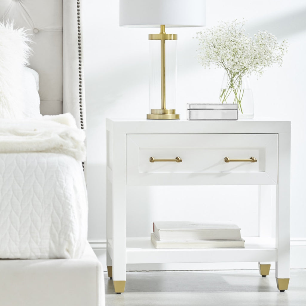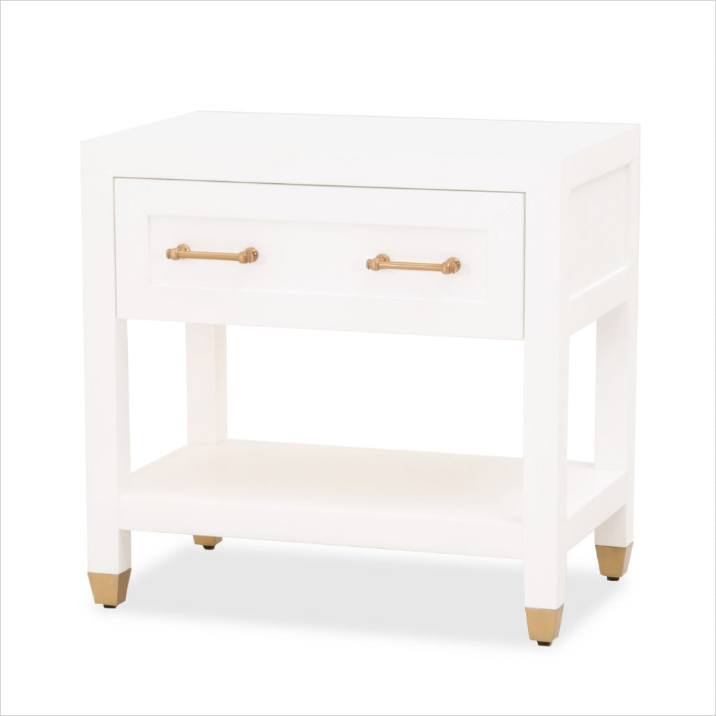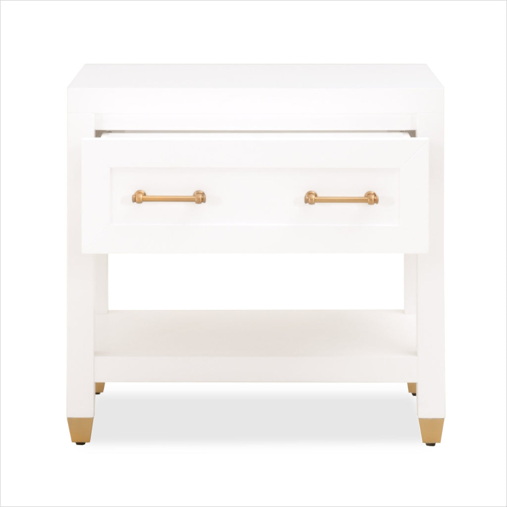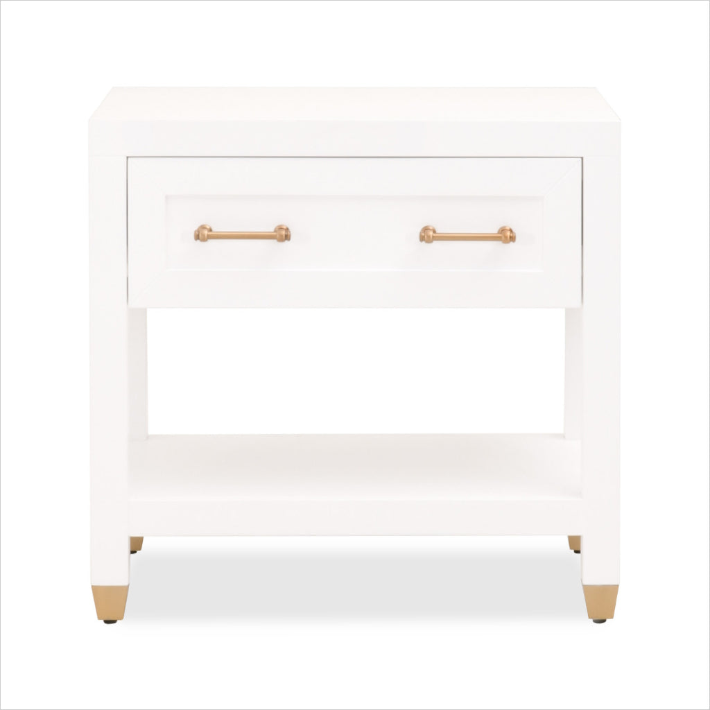 La table de chevet Bella respire l'élégance discrète avec son design intemporel, sa finition blanc mat et ses luxueuses poignées et pieds en or brossé. Elle est équipée de tiroirs à coulisses métalliques à extension complète et d'une étagère inférieure pour un rangement supplémentaire.