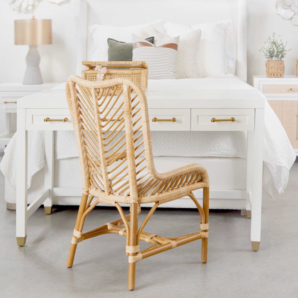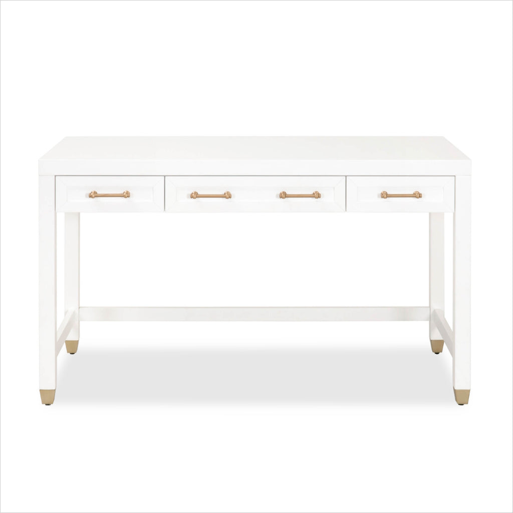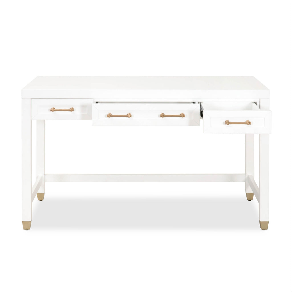 Le bureau Bella respire l'élégance discrète avec son design intemporel, sa finition blanc mat et ses luxueux boutons et patins en or brossé. Il est équipé de trois tiroirs coulissants en métal à extension complète. Tous les côtés sont finis pour un agencement aérien.