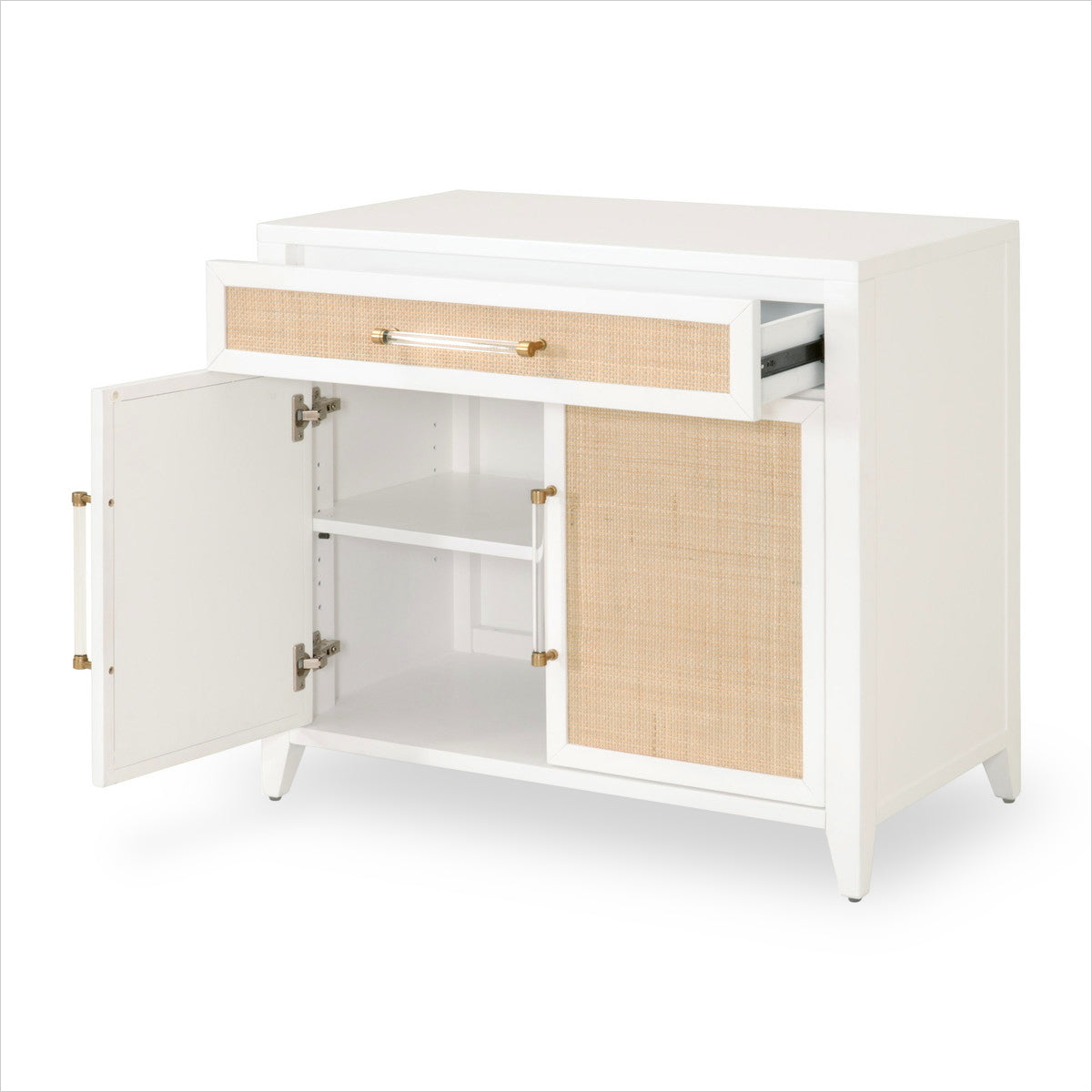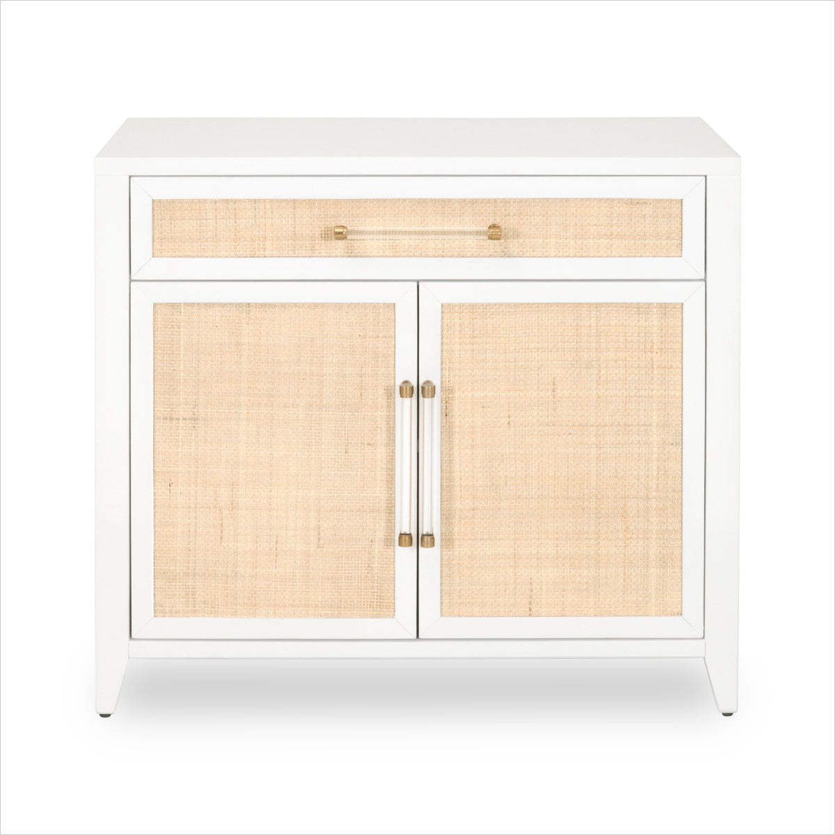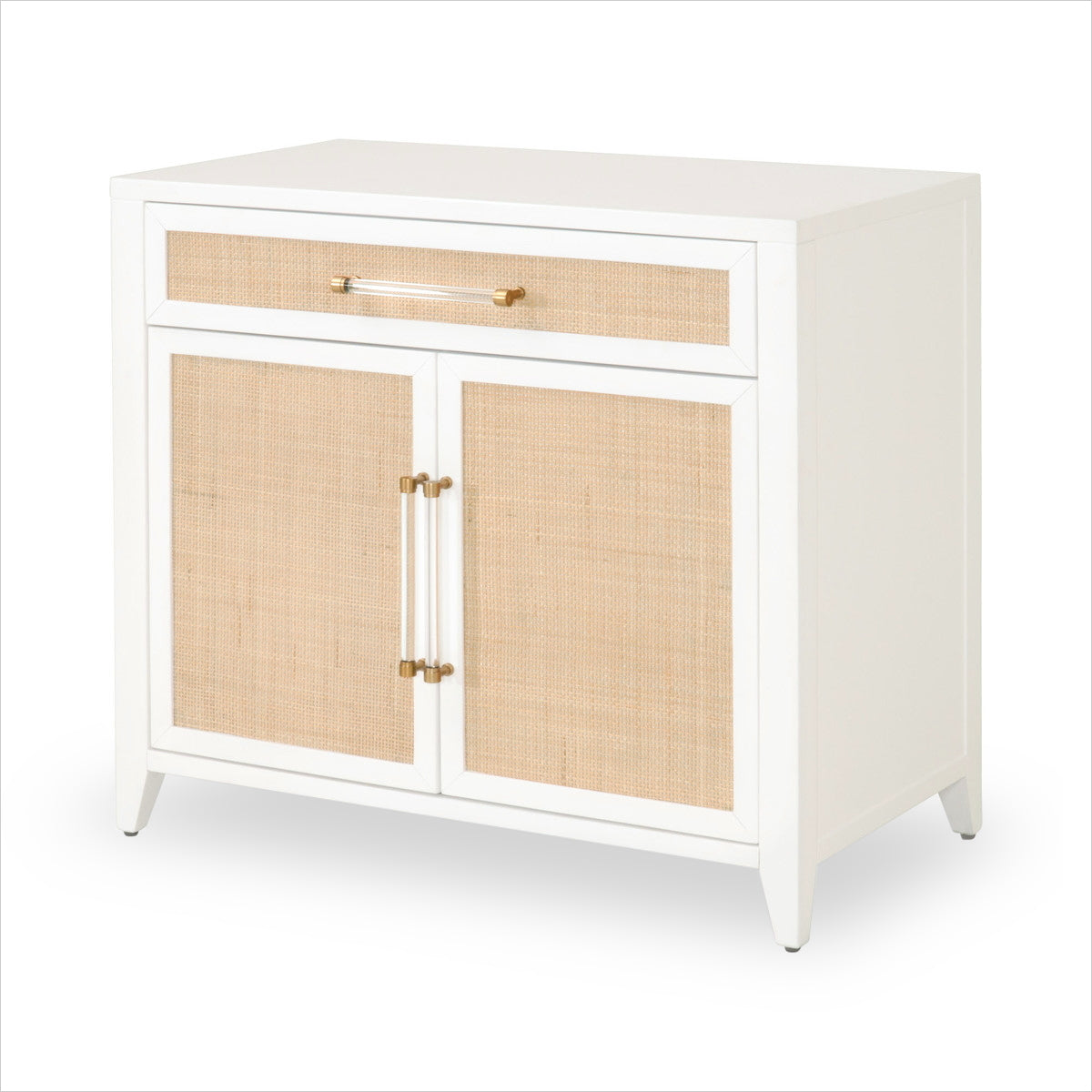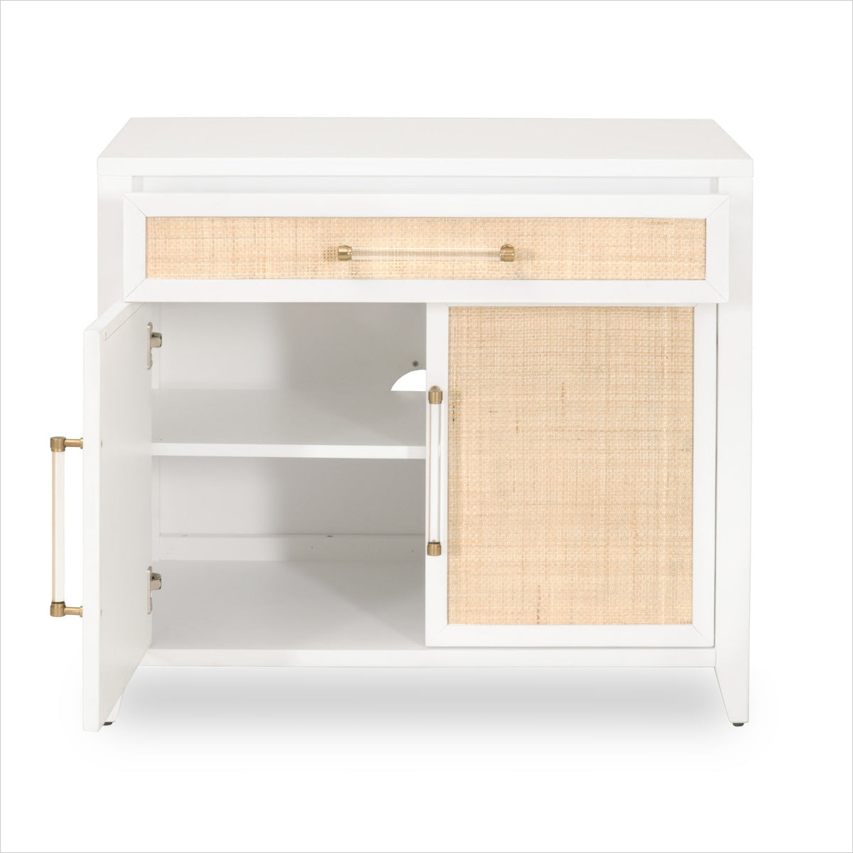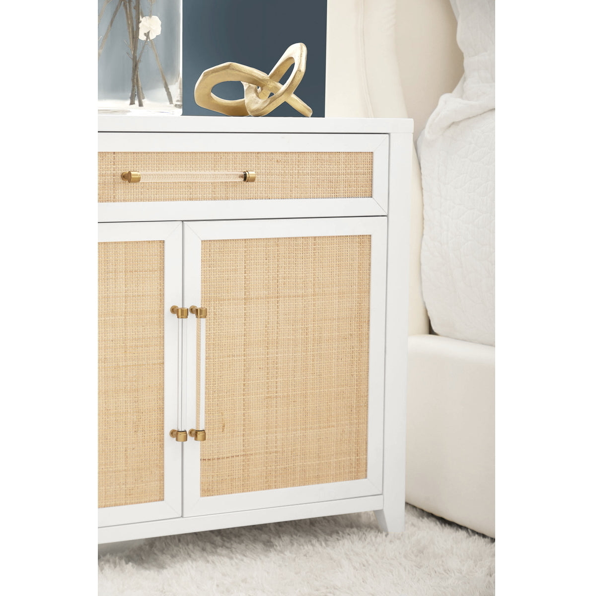 La commode Brussels est une pièce maîtresse avec ses portes à panneaux en rotin. Polyvalente, elle dispose d'un tiroir avec une étagère réglable et un passe-câble. Idéale pour tout espace de rangement supplémentaire, elle peut servir de table de chevet ou de meuble multimédia. Ses portes sont à fermeture amortie et rehaussées de poignées en acrylique et laiton. Un buffet/meuble multimédia assorti est disponible.