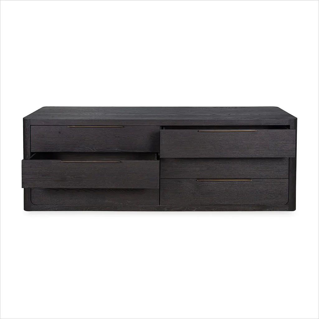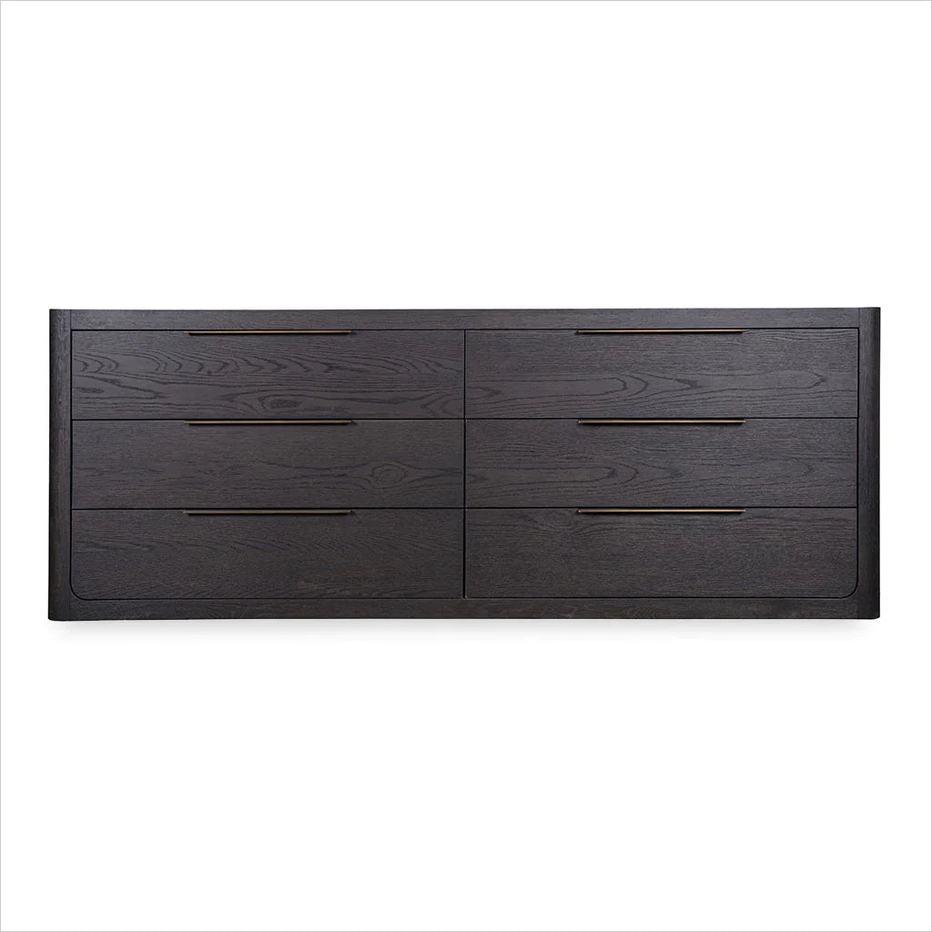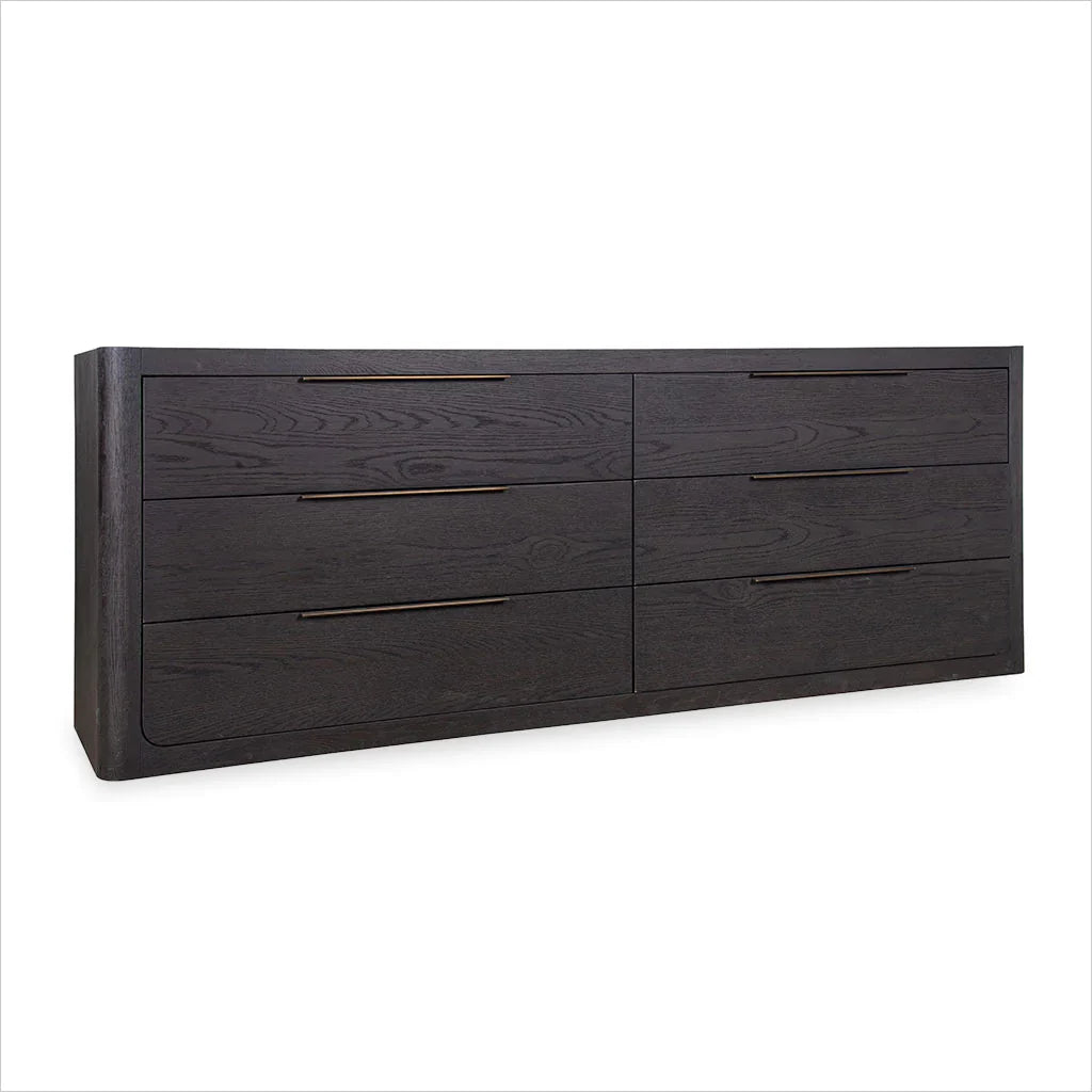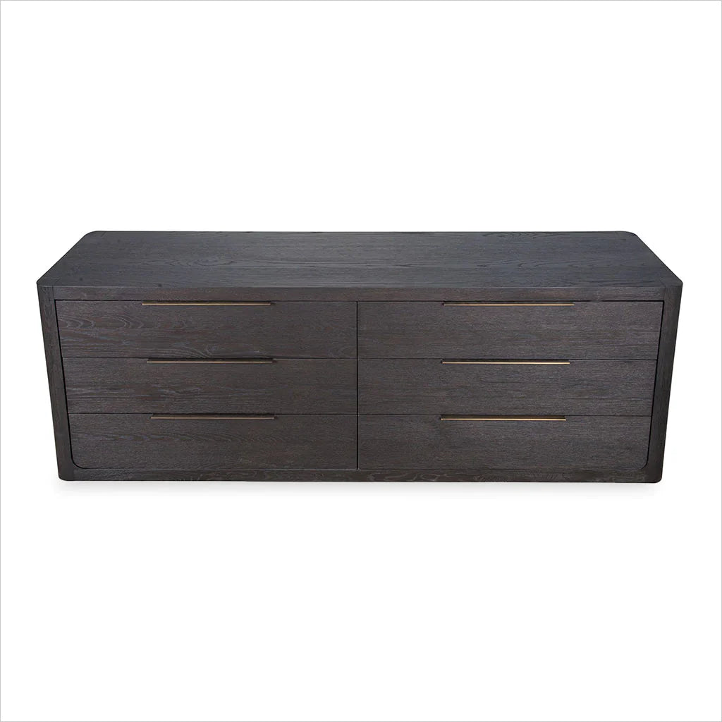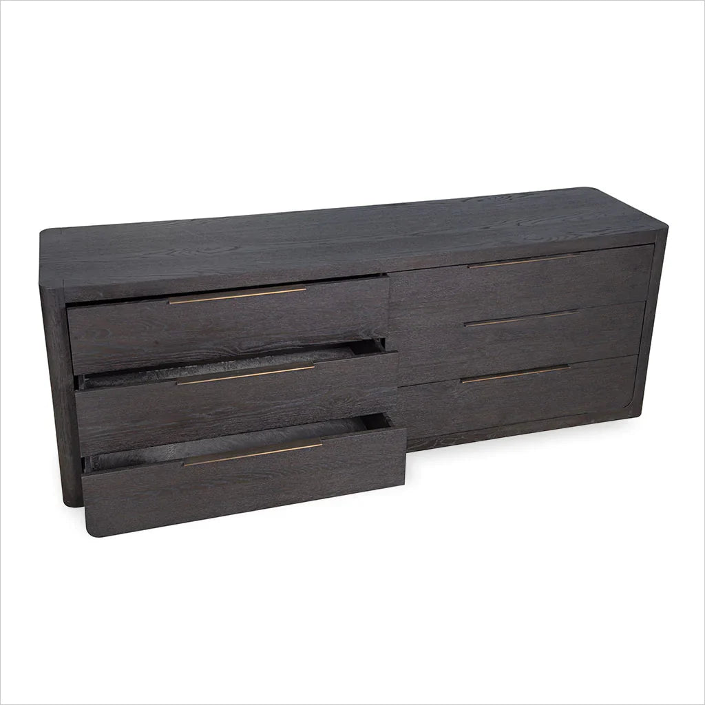 Cette commode Luna est parfaite pour organiser votre chambre grâce à son superbe chêne français teinté anthracite. Dotée de 6 tiroirs, elle est idéale pour ranger vêtements, couvertures et autres objets. Ses bords arrondis lui confèrent une douceur contemporaine, ainsi que ses élégantes poignées en métal doré.