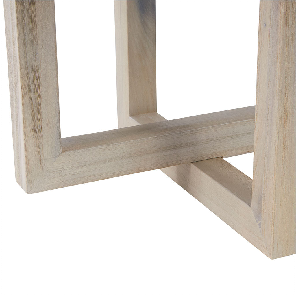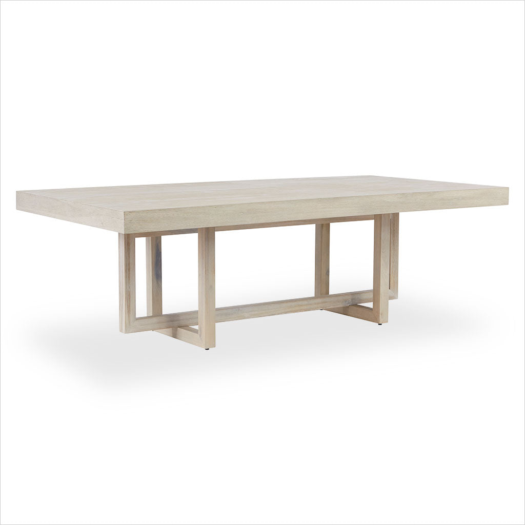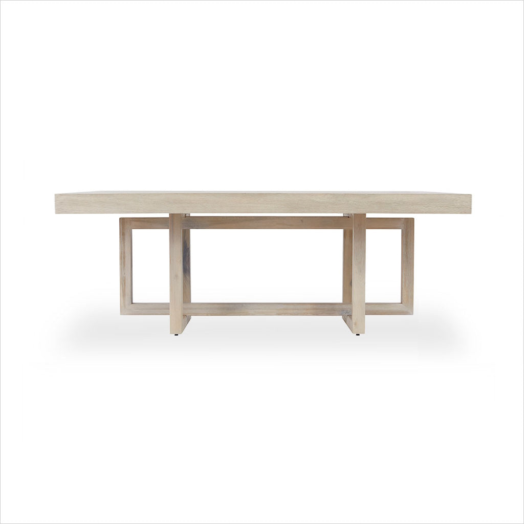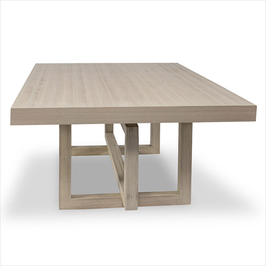 La table à manger Tulum fait partie d'une nouvelle collection en peuplier brossé couleur orge clair. Son piètement croisé crée un design unique qui s'harmonise avec tous les espaces. Disponible en deux tailles : 23,5 m (78 pi, comme illustré) et 29,5 m (94 pi). Un buffet, des chaises, une console, une table basse et des tables d'appoint sont également disponibles.