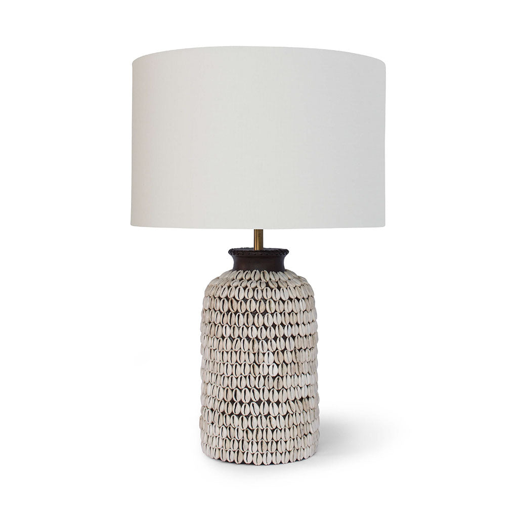 La lampe Costa est fabriquée à la main avec une grande minutie, avec des coquillages cauris soigneusement sélectionnés et des touches de cuir. Ce jeu de textures apportera une touche chaleureuse à votre intérieur. Col et douille en laiton antique, abat-jour tambour en lin, 60 W max.