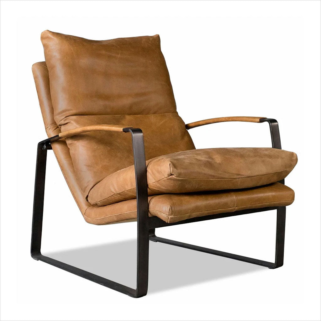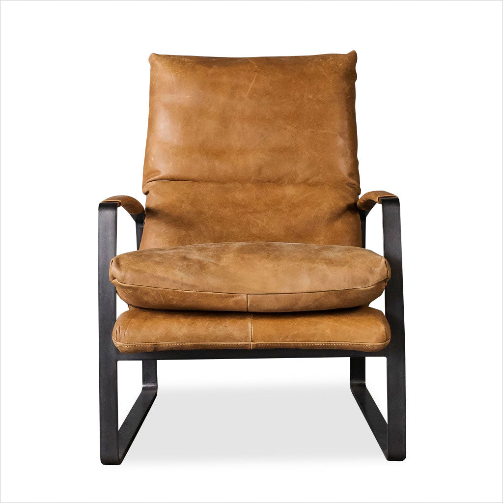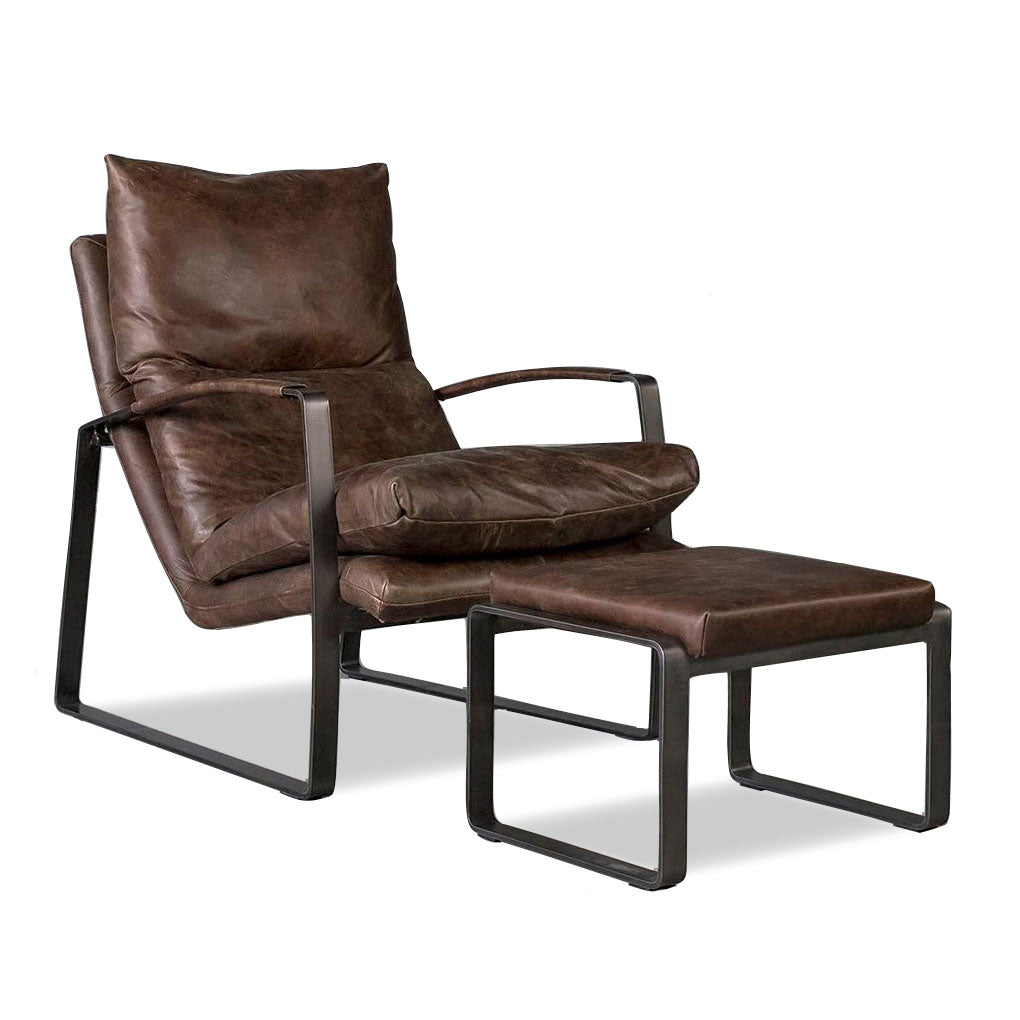 Le fauteuil Damo est élégamment conçu pour un confort optimal, avec son cuir aniline souple et ses généreux coussins en plumes et duvet. Sa position inclinée offre un confort optimal et une détente optimale. Les accoudoirs gainés de cuir contrastent avec le fer noir clair. Nous proposons le Damo en cuir cognac, noir et marron. Un pouf assorti est également disponible.