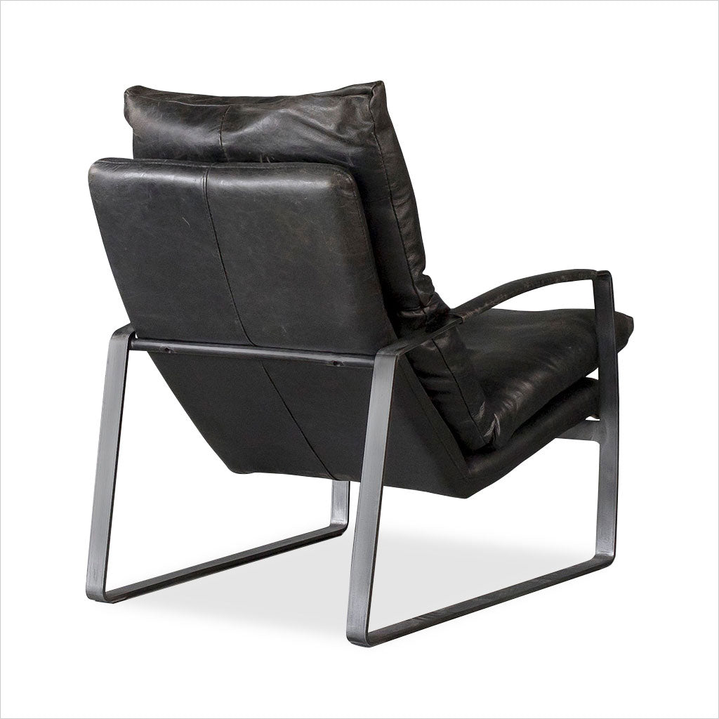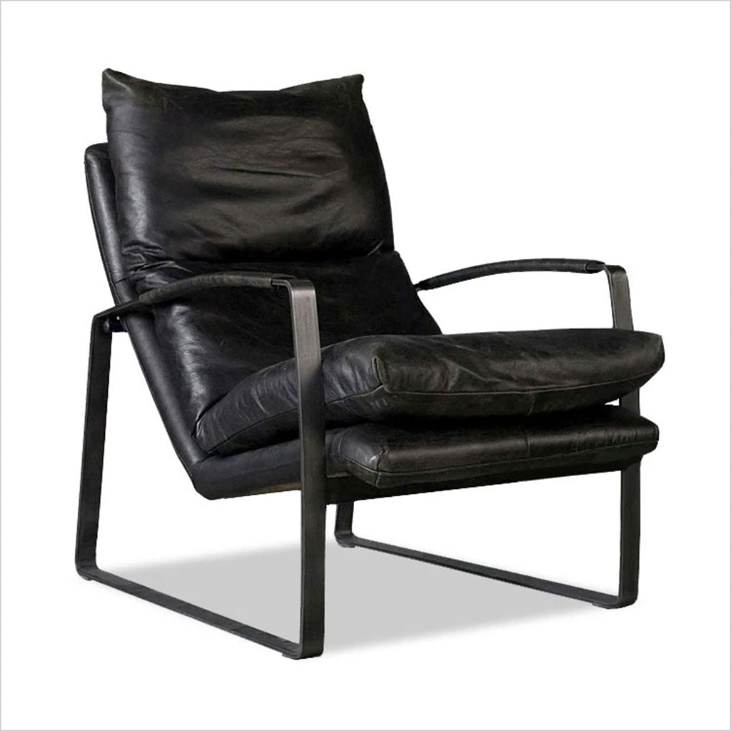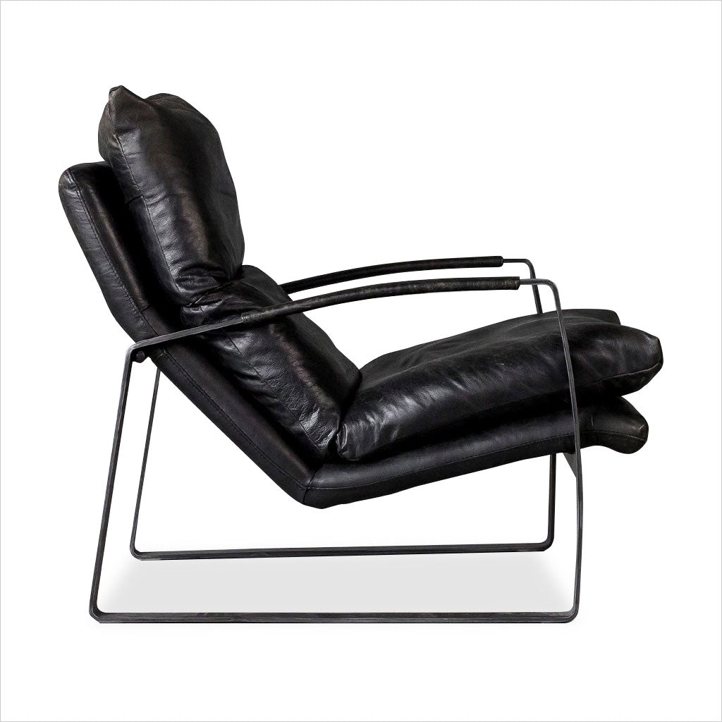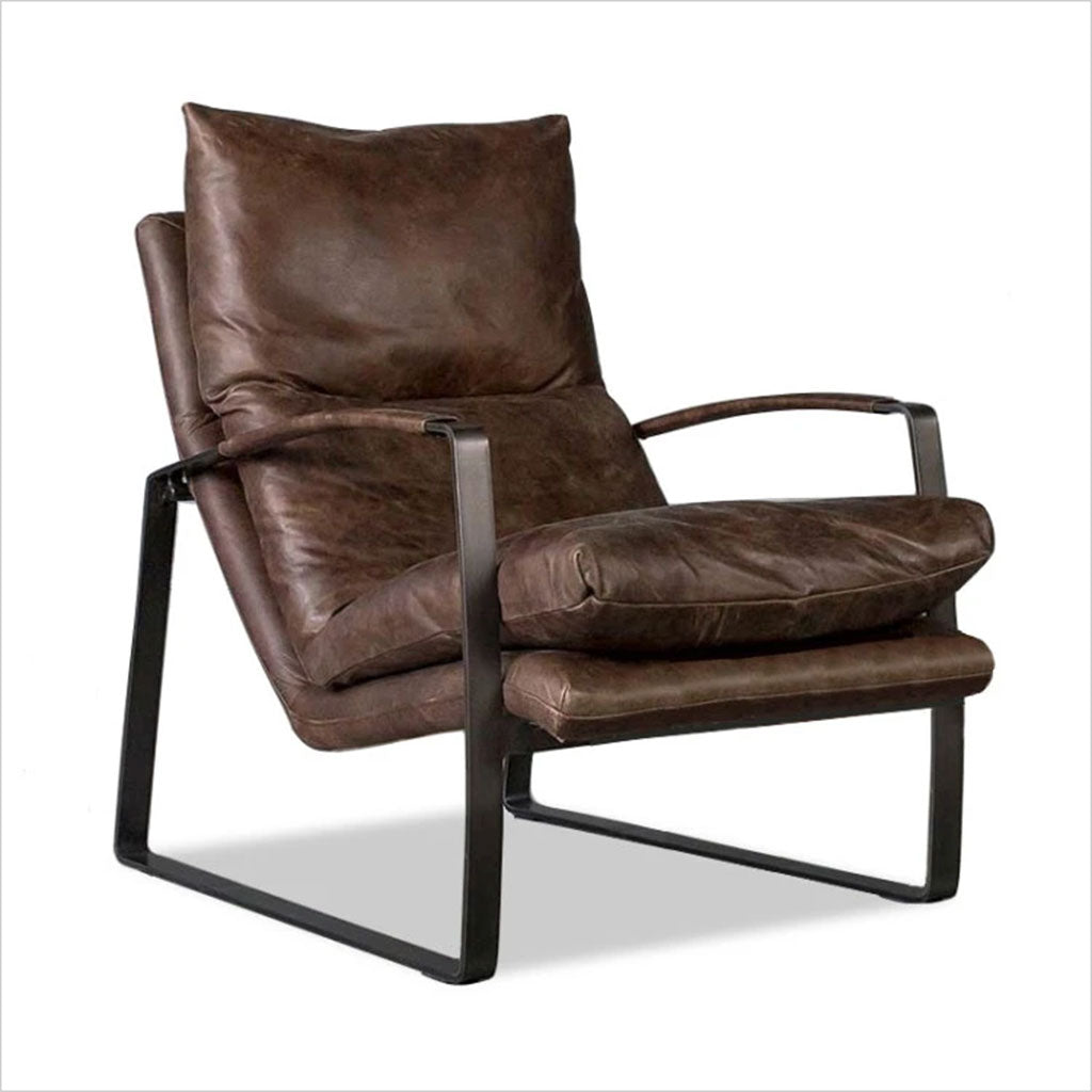 Le fauteuil Damo est élégamment conçu pour un confort optimal, avec son cuir aniline souple et ses généreux coussins en plumes et duvet. Sa position inclinée offre un confort optimal et une détente optimale. Les accoudoirs gainés de cuir contrastent avec le fer noir clair. Nous proposons le Damo en cuir cognac, noir et marron. Un pouf assorti est également disponible.