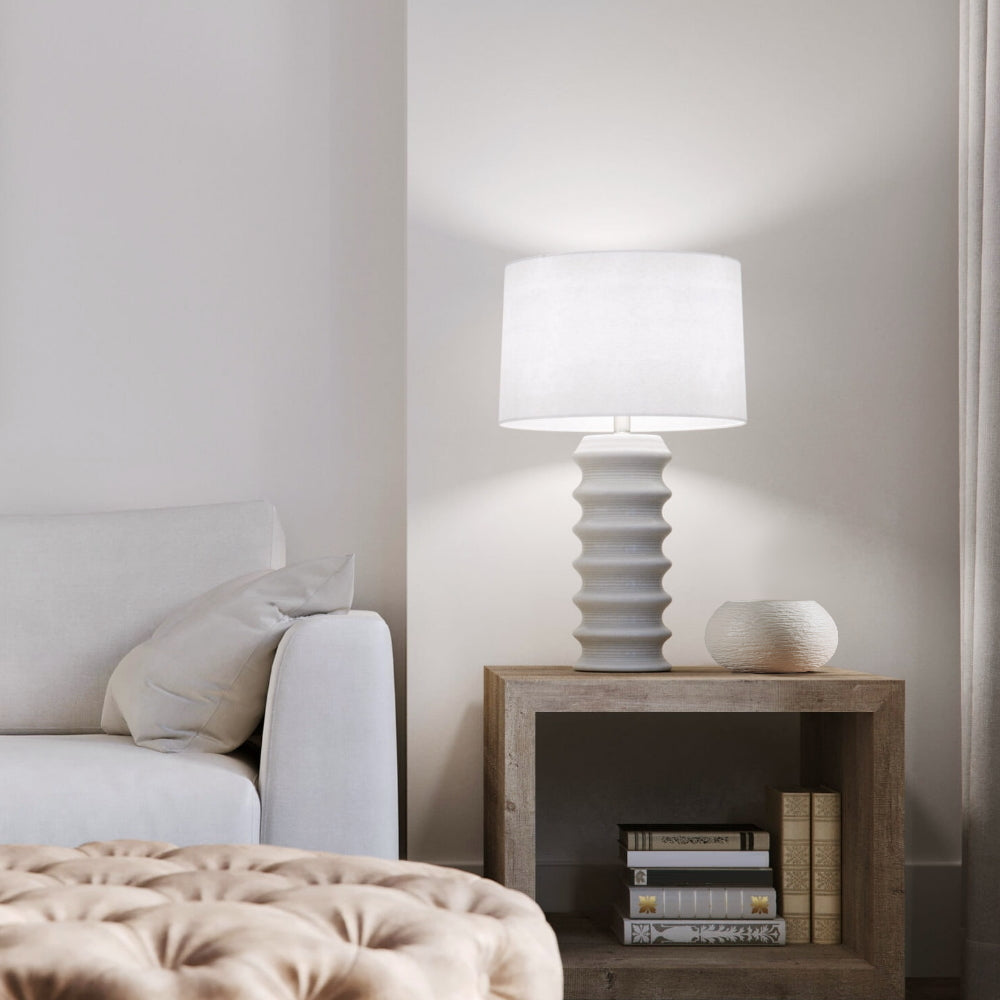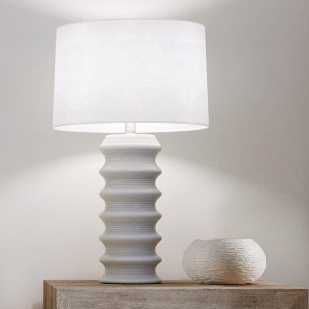 La lampe Downey est sculpturale et ses formes ondulantes ajoutent une touche d'impact à n'importe quelle pièce. La céramique est blanc cassé avec une finition émaillée. L'abat-jour est en coton blanc cassé et surmonté d'une quincaillerie argentée.