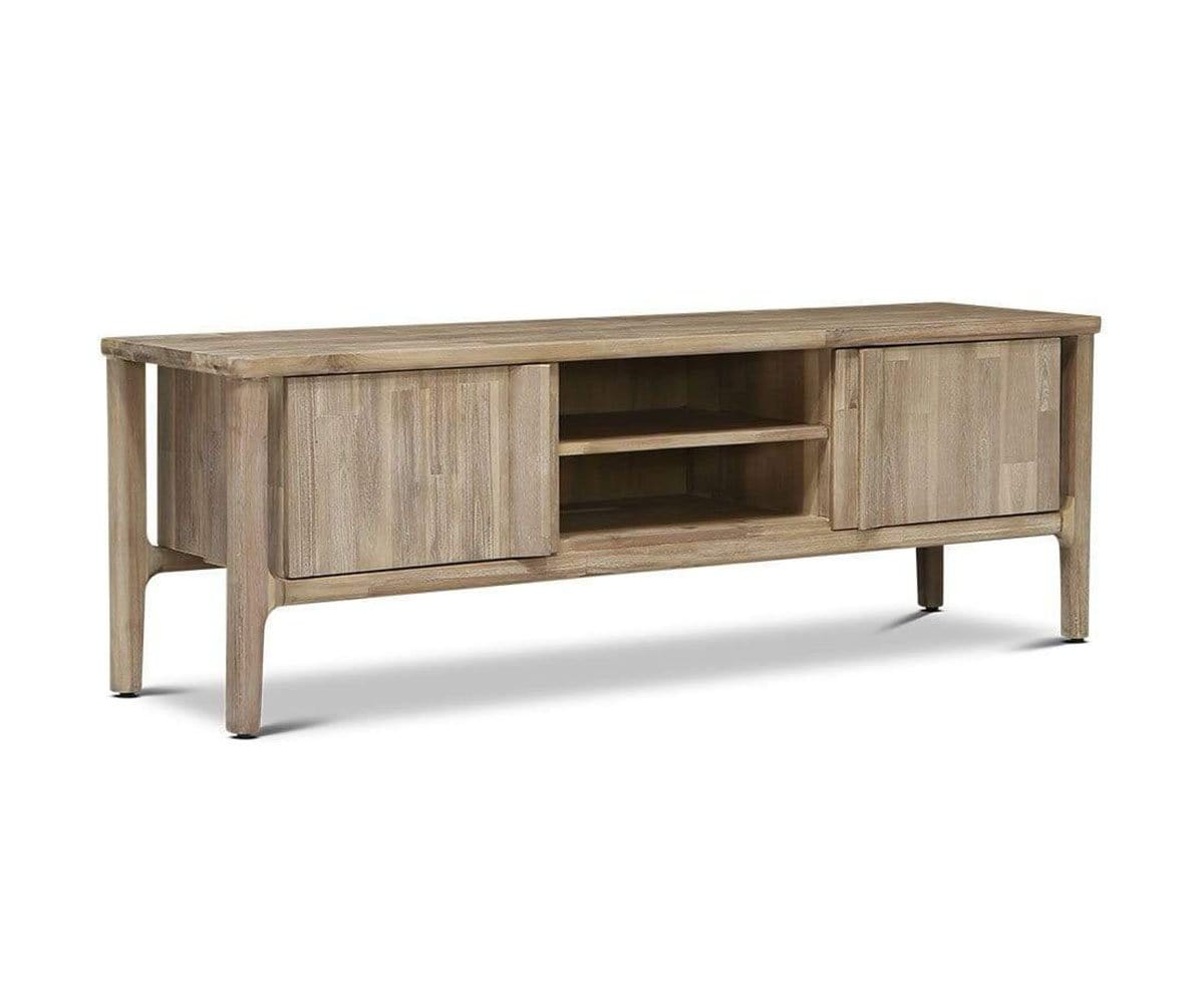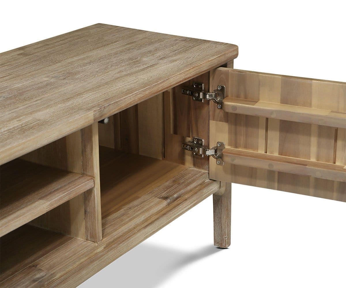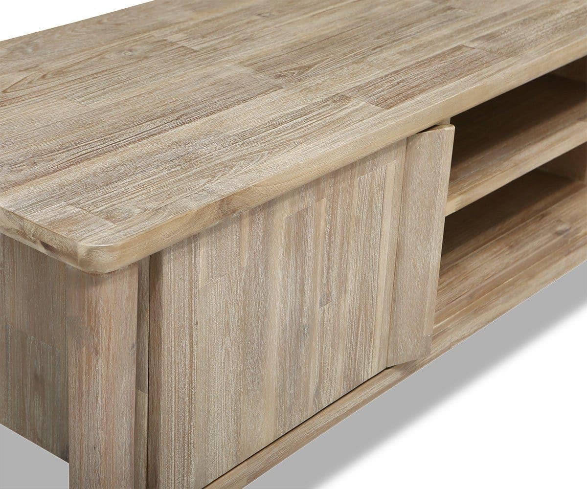 Le meuble multimédia Eckler allie charme rustique et élégance contemporaine grâce à ses bords arrondis, ses lignes épurées et sa teinte grise unique qui accentue le veinage tourbillonnant du bois d'acacia. Ce meuble est doté d'étagères fixes et de compartiments pratiques pour ranger appareils électroniques et autres objets essentiels du salon.