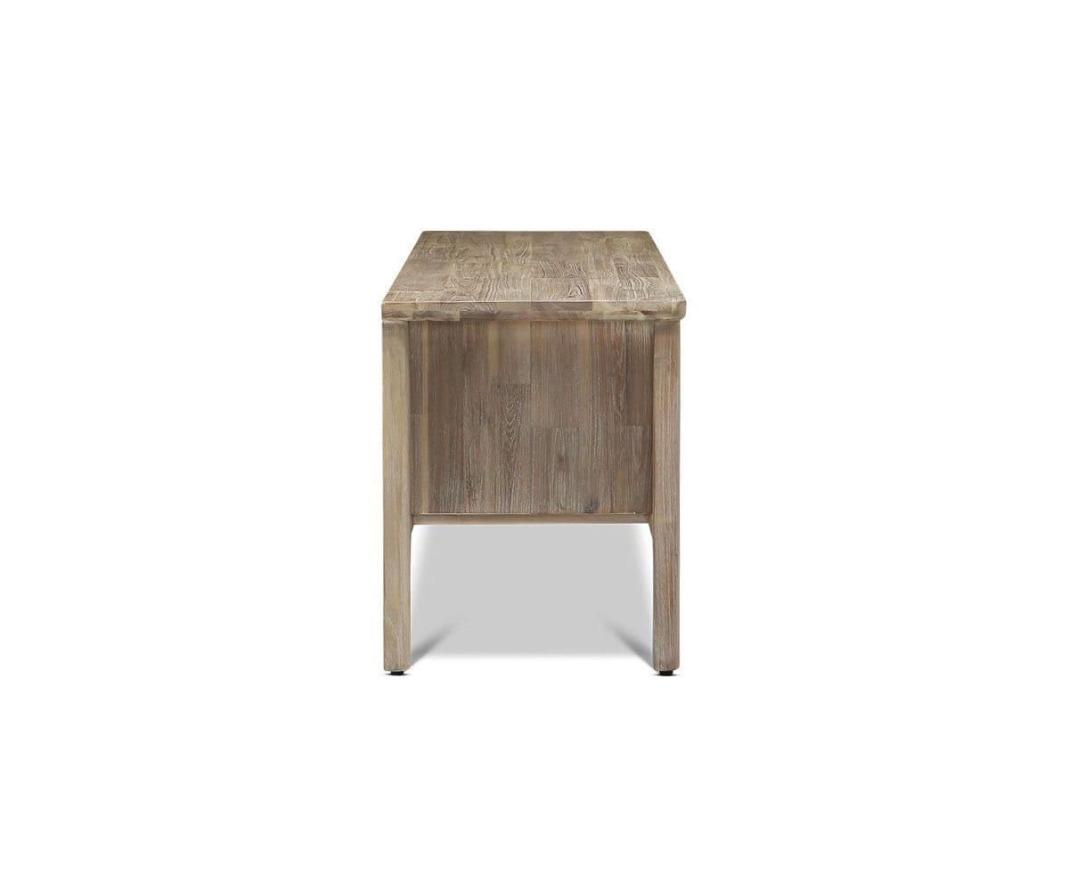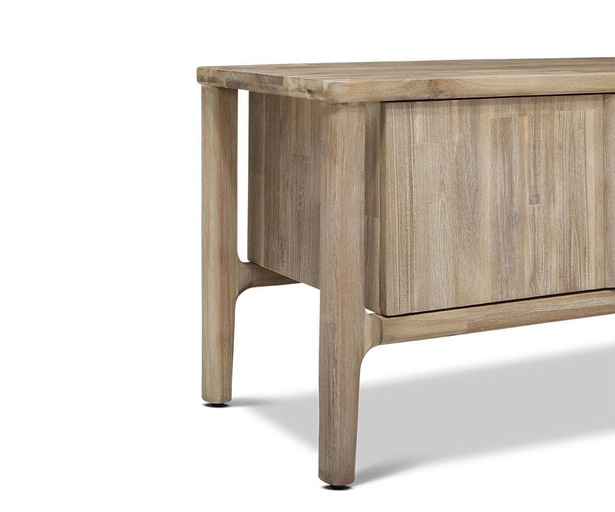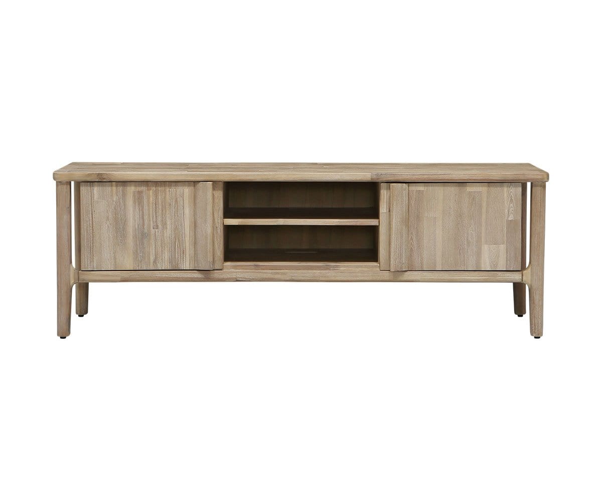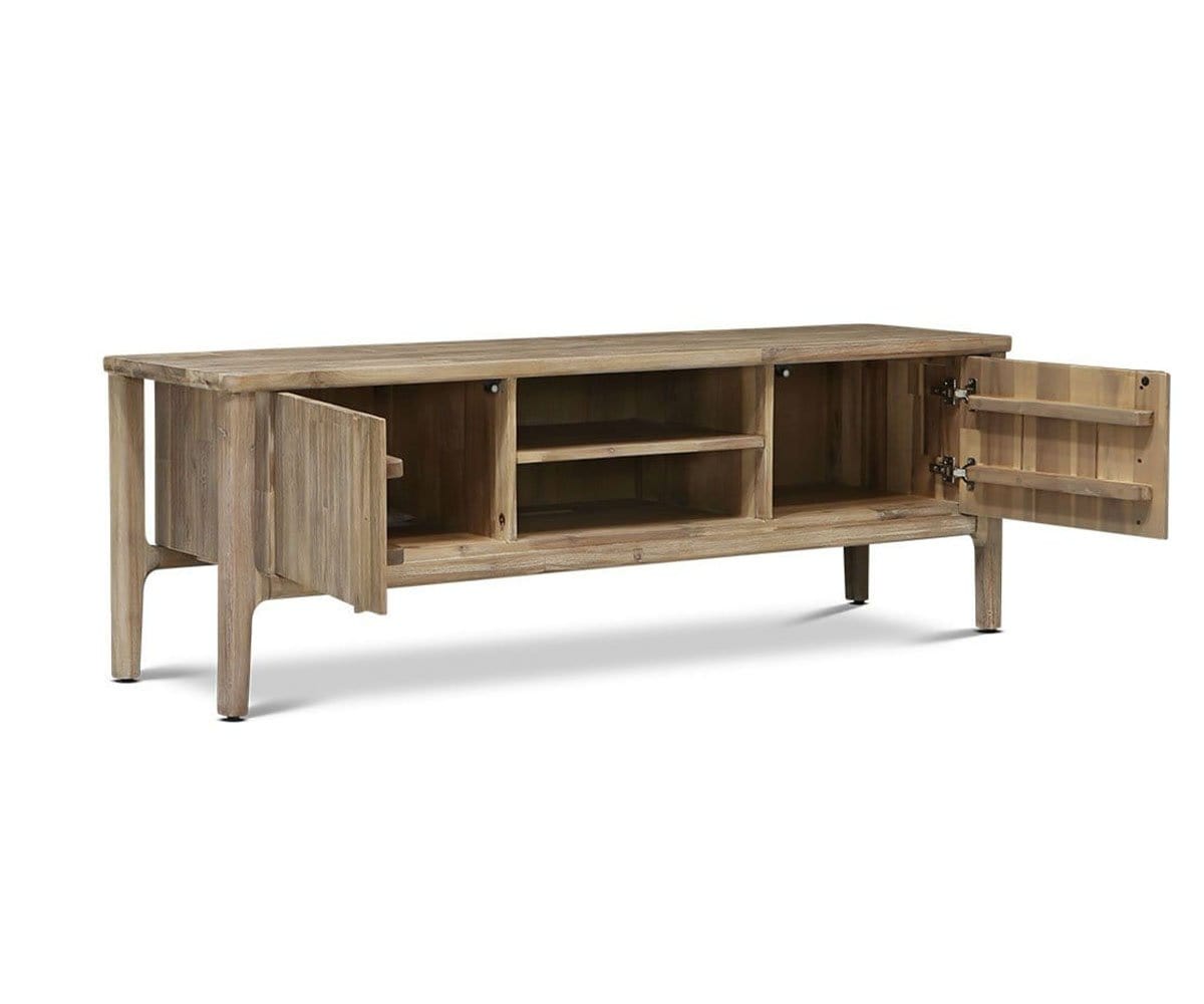 Le meuble multimédia Eckler allie charme rustique et élégance contemporaine grâce à ses bords arrondis, ses lignes épurées et sa teinte grise unique qui accentue le veinage tourbillonnant du bois d'acacia. Ce meuble est doté d'étagères fixes et de compartiments pratiques pour ranger appareils électroniques et autres objets essentiels du salon.