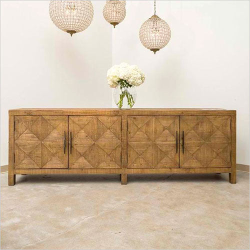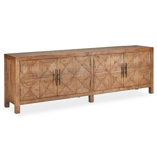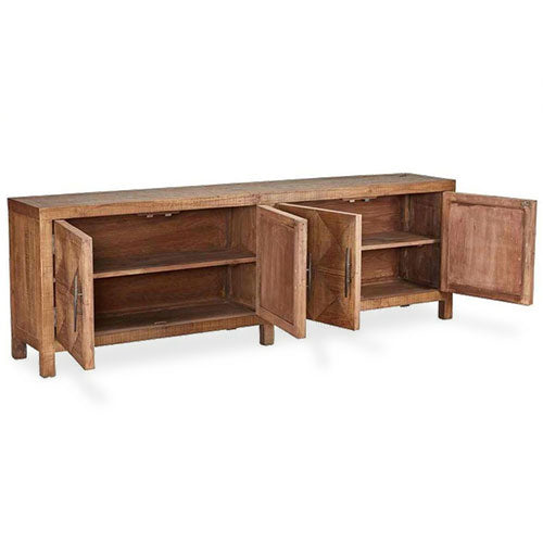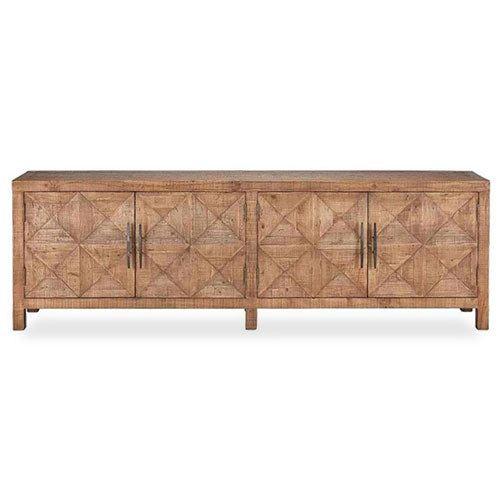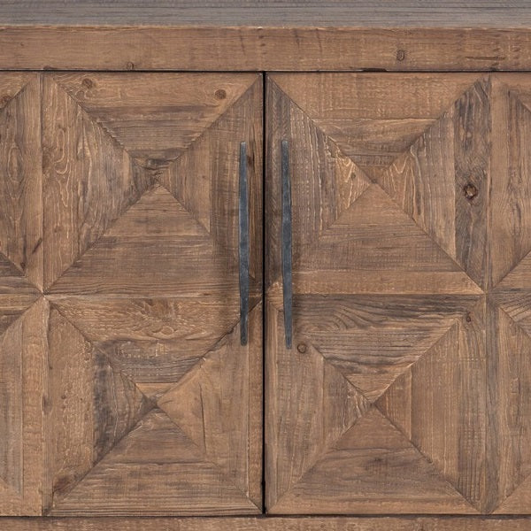 Le buffet Elena est fabriqué en pin massif recyclé. Ses portes à motif damier et sa quincaillerie en fer soulignent le savoir-faire unique de ce meuble.