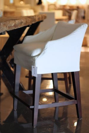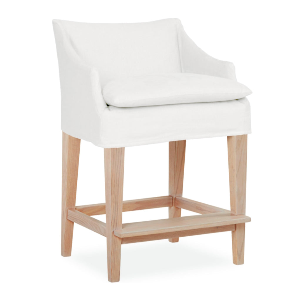 Le tabouret de bar Erin est recouvert d'un tissu lavable blanc Boomer avec finition naturelle sur bois de chêne massif. Son repose-pieds et son coussin d'assise pratiques en font un endroit où il fait bon s'attarder. Disponible sur commande dans de nombreux tissus et finitions ; voir d'autres exemples.