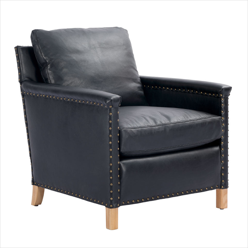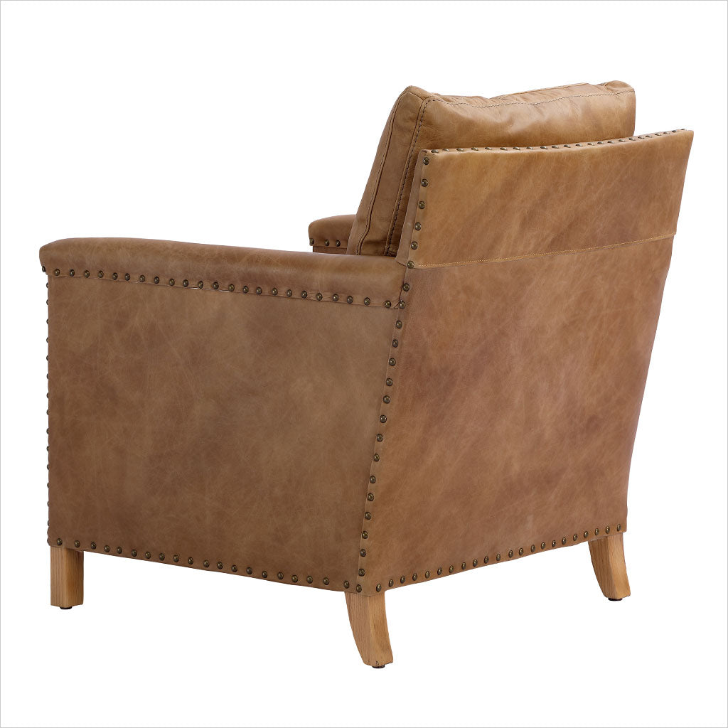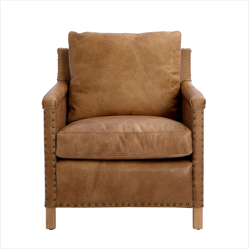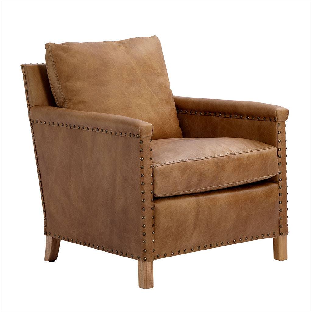 La chaise Finn est revêtue de cuir cognac ou noir avec des clous bronze et des coutures françaises. Le cuir souple et les coussins garnis de duvet offrent un confort durable. Pieds en chêne naturel.