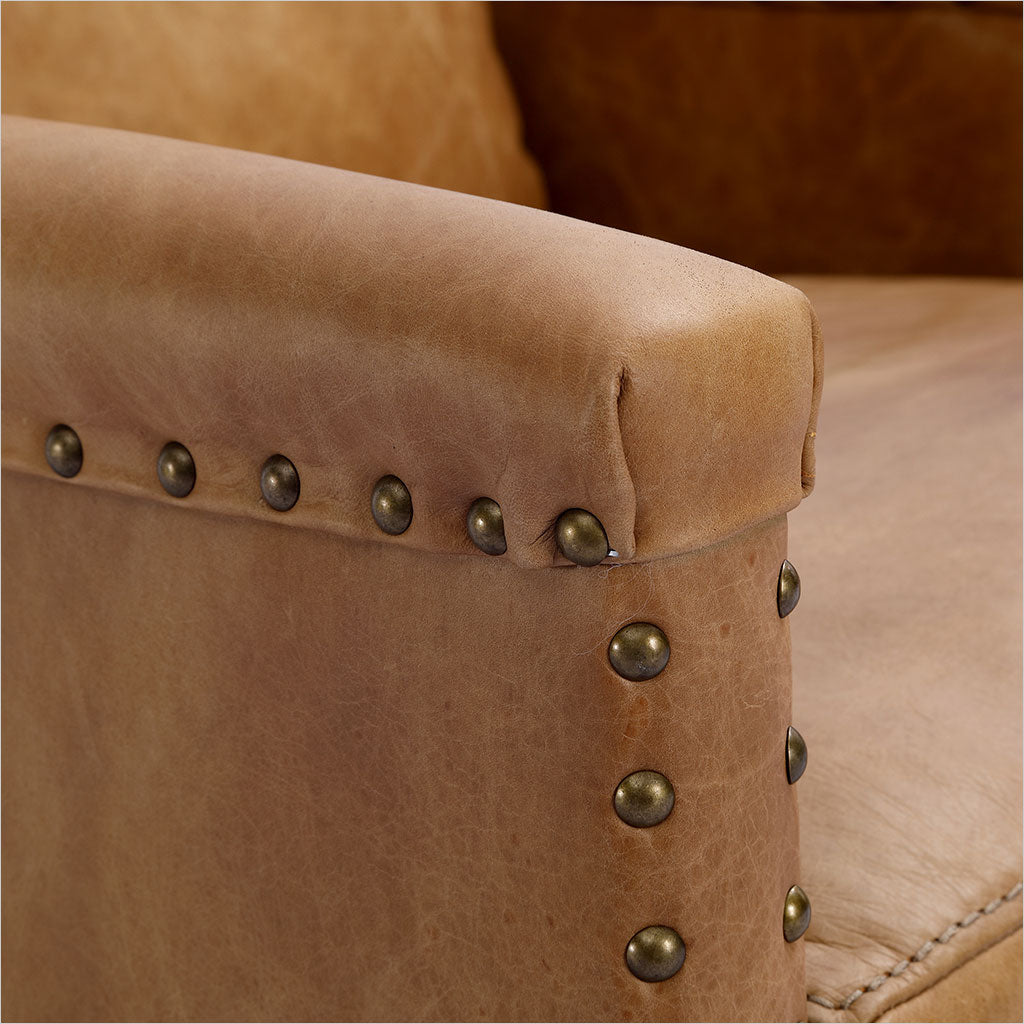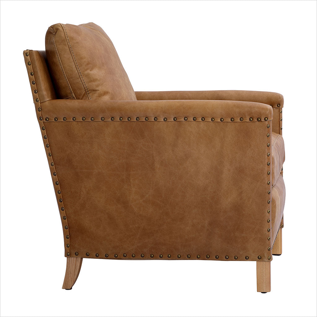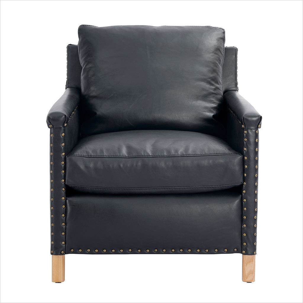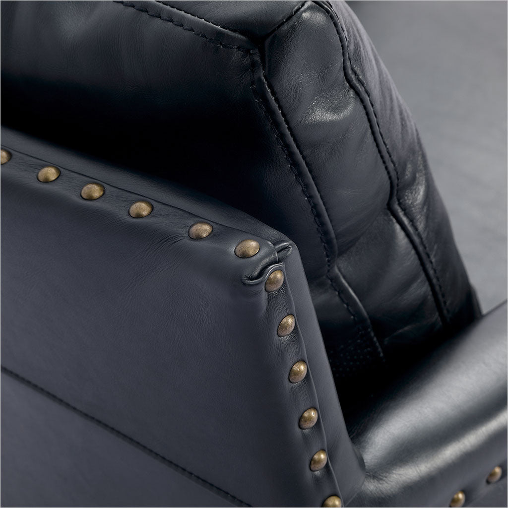 La chaise Finn est revêtue de cuir cognac ou noir avec des clous bronze et des coutures françaises. Le cuir souple et les coussins garnis de duvet offrent un confort durable. Pieds en chêne naturel.
