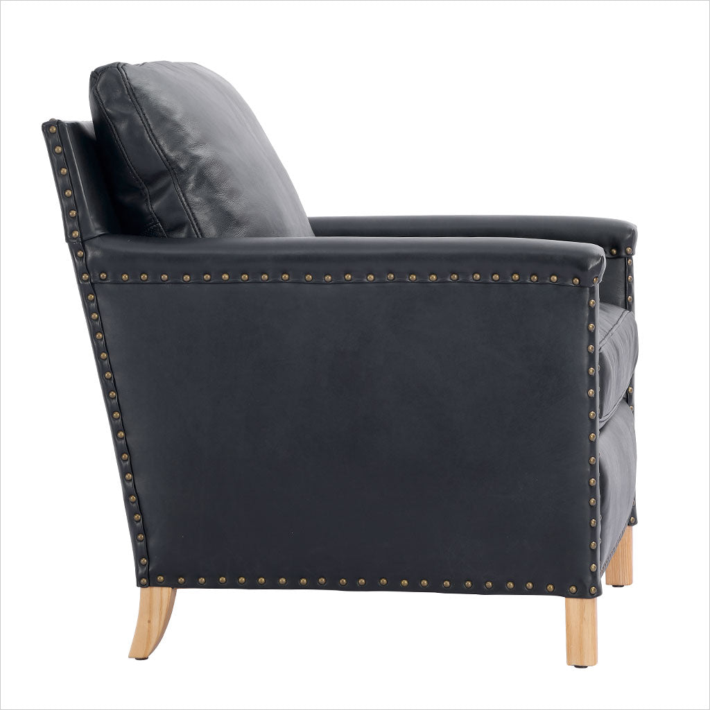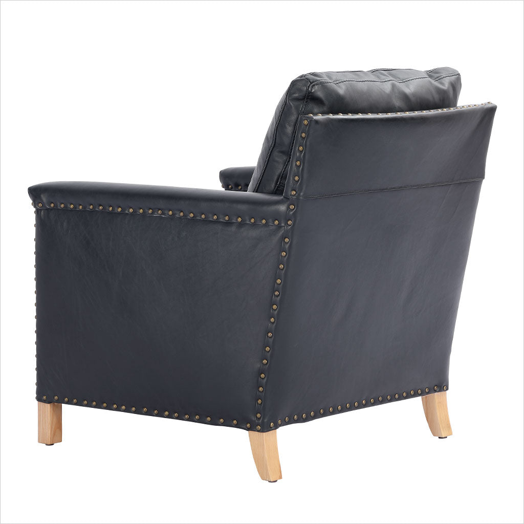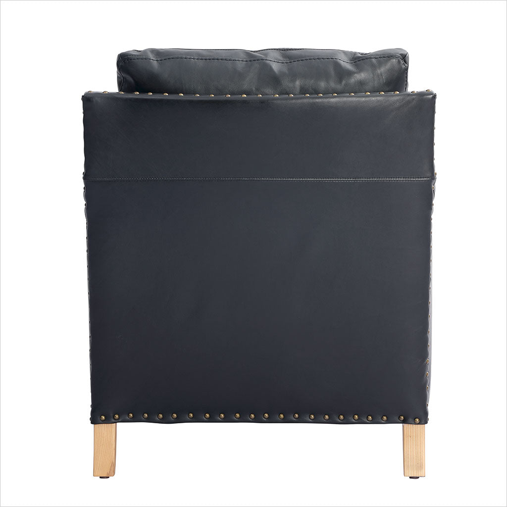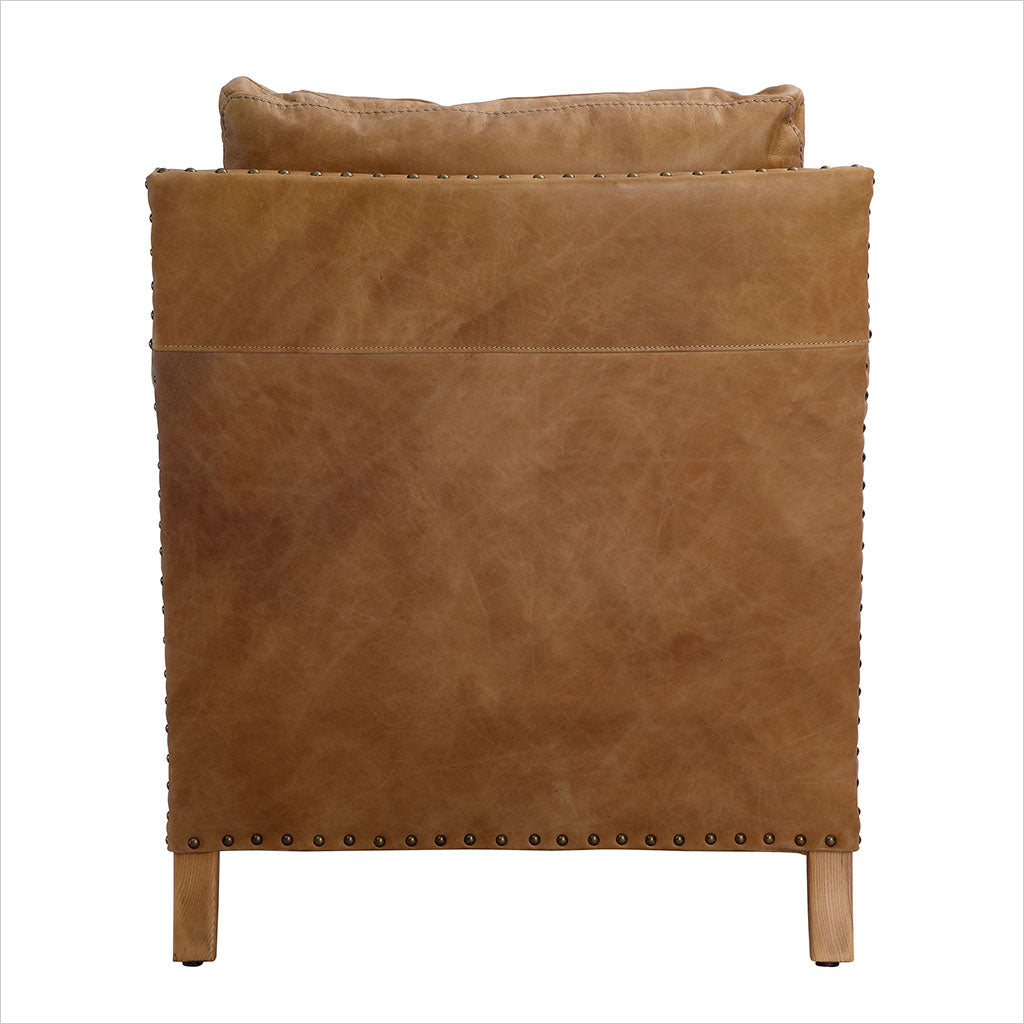 La chaise Finn est revêtue de cuir cognac ou noir avec des clous bronze et des coutures françaises. Le cuir souple et les coussins garnis de duvet offrent un confort durable. Pieds en chêne naturel.