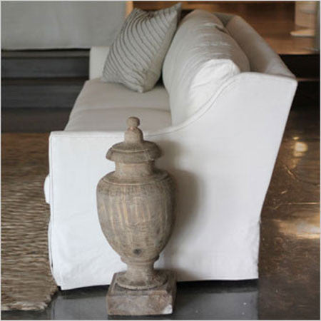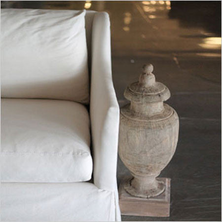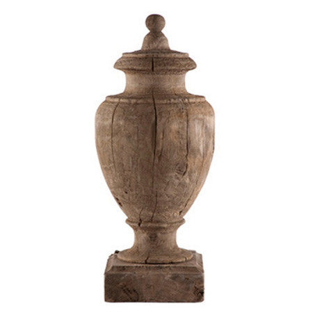 Ce grand fleuron en bois ancien est vieilli pour refléter l'usure du temps : des morceaux ont été retirés, de larges fissures et une surface patinée. Cette urne n'est pas traitée et, avec le temps, elle vieillira et se fissurera, ce qui lui confèrera un charme supplémentaire. Affirmez votre style en les associant pour un effet graphique.