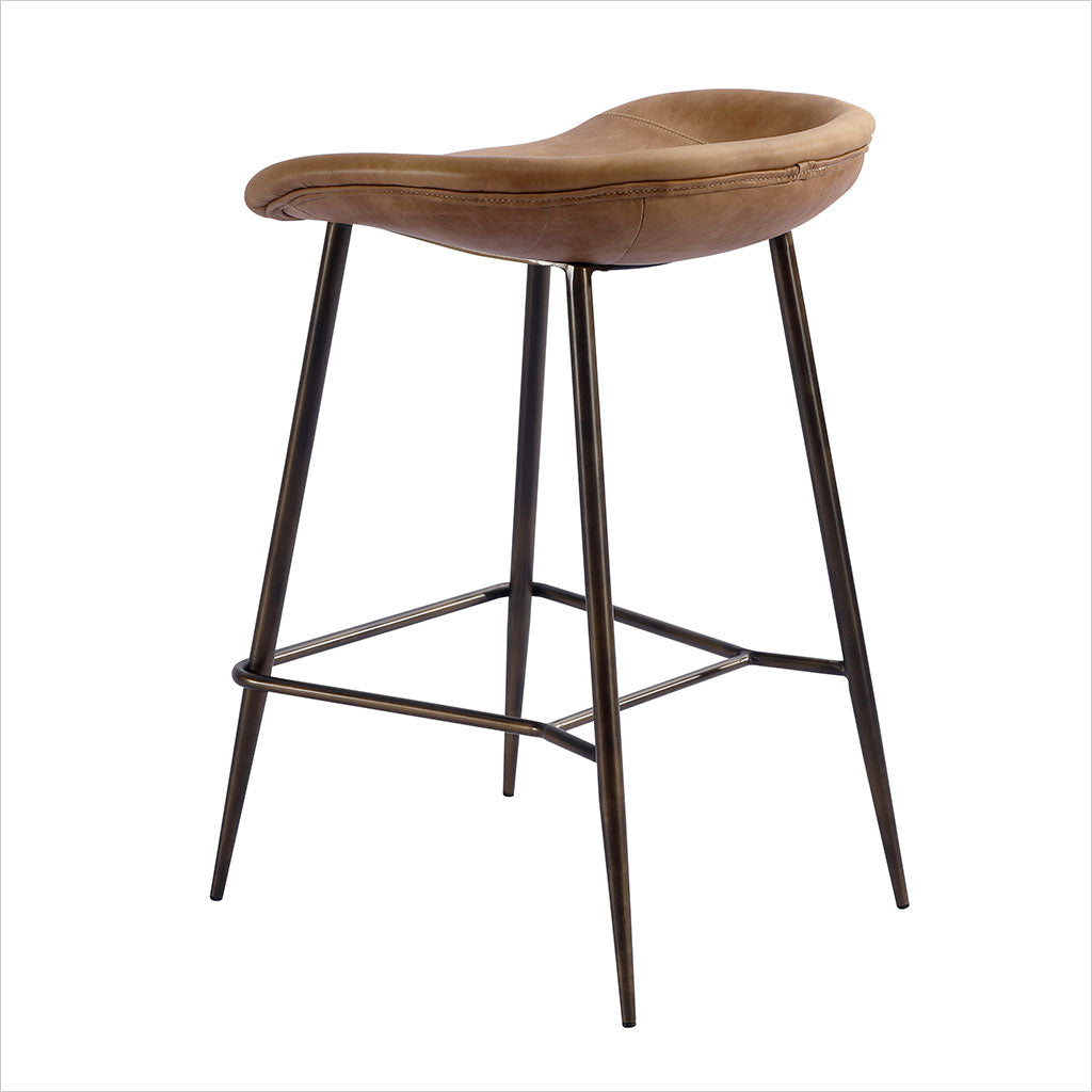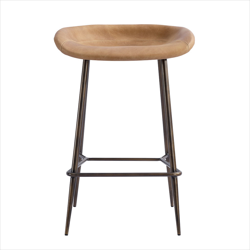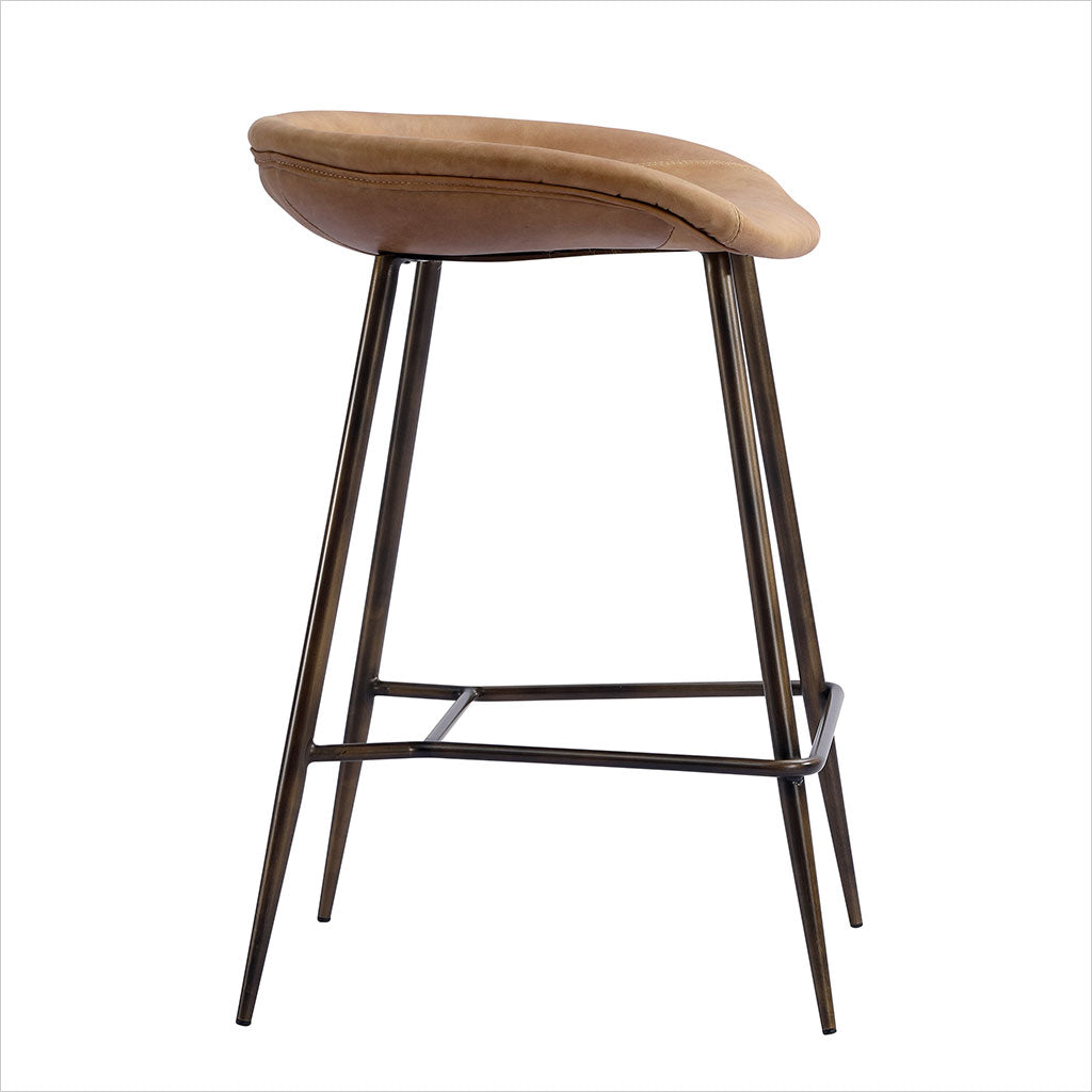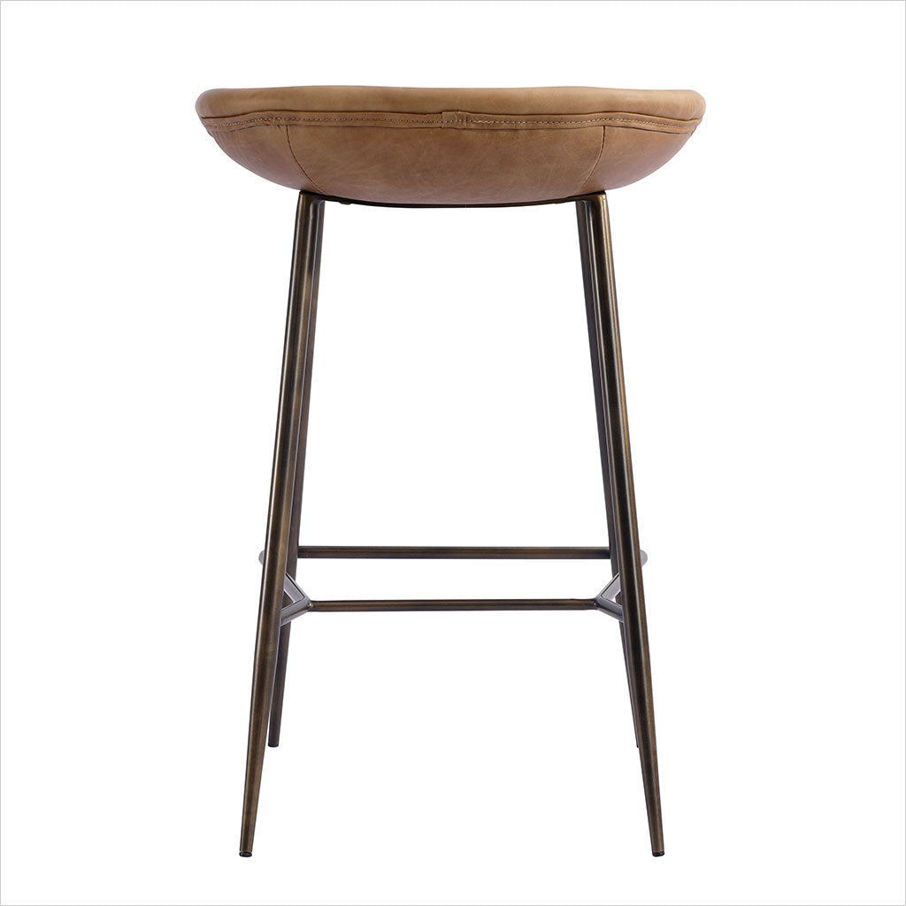 Le tabouret de bar Francisco est doté d'une assise sculptée et profilée pour plus de confort, avec des pieds fuselés en bronze. Disponible en cuir Congac ou noir.