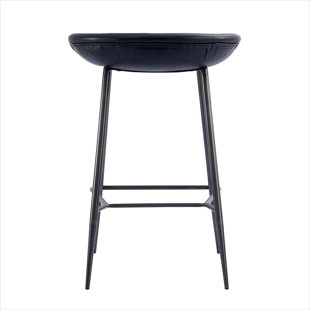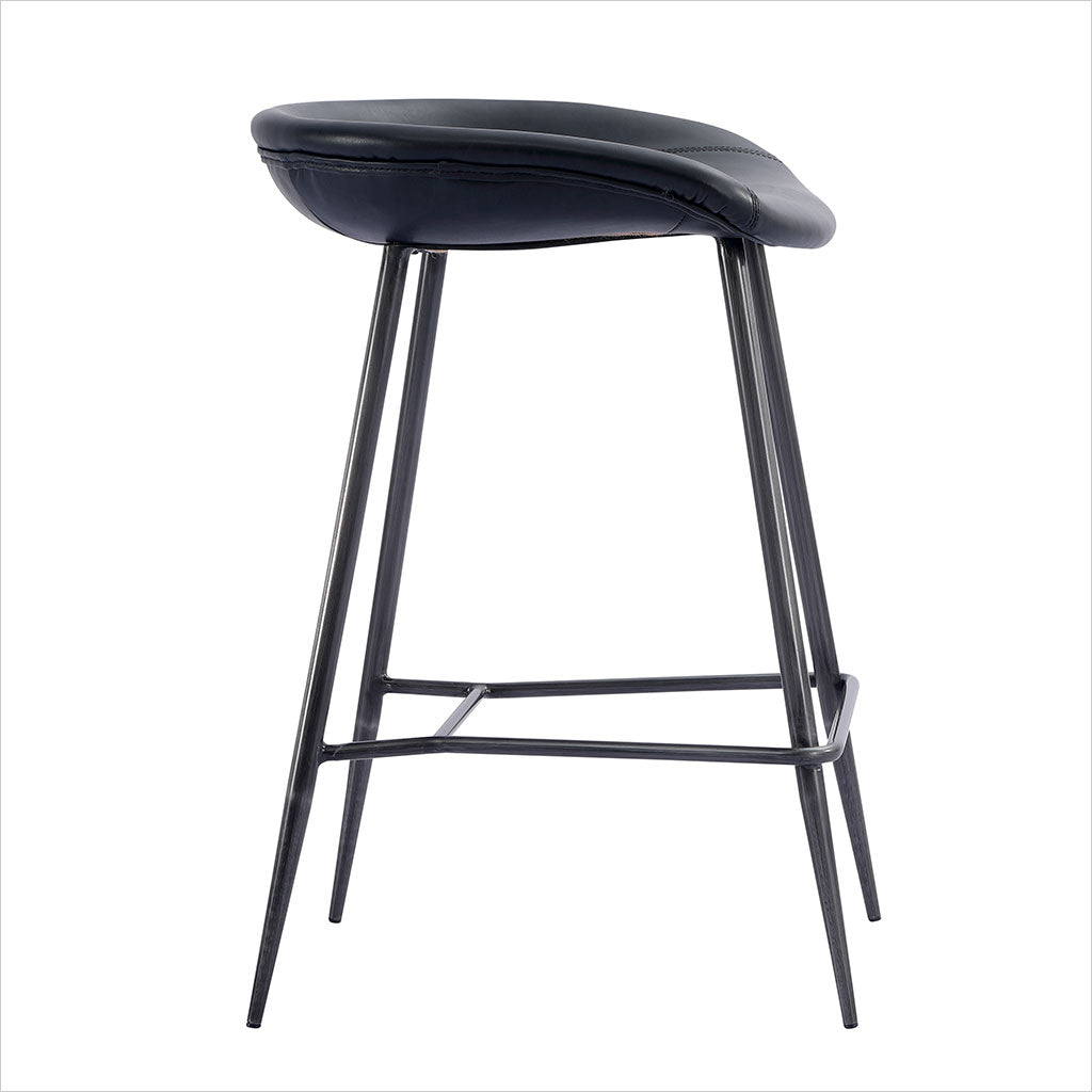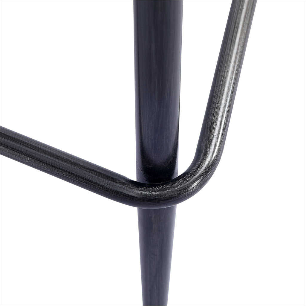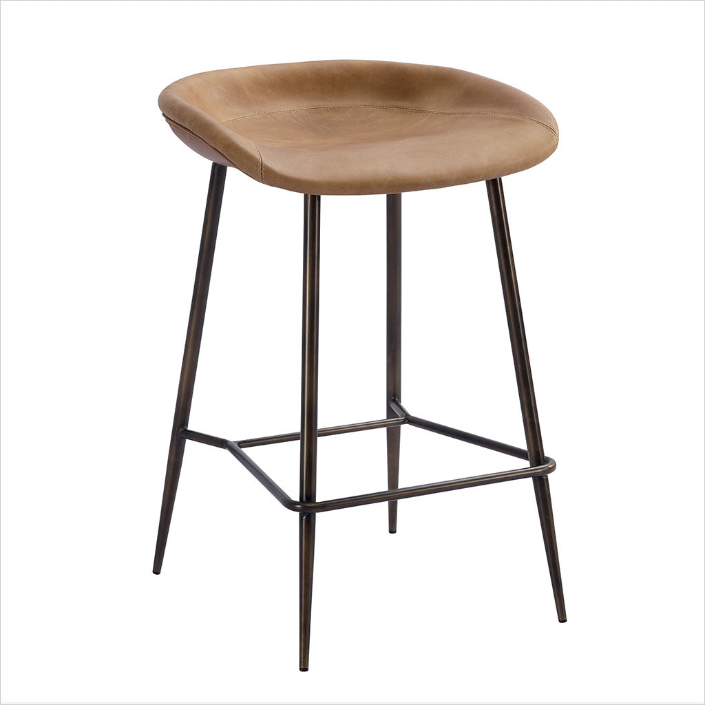 Le tabouret de bar Francisco est doté d'une assise sculptée et profilée pour plus de confort, avec des pieds fuselés en bronze. Disponible en cuir Congac ou noir.