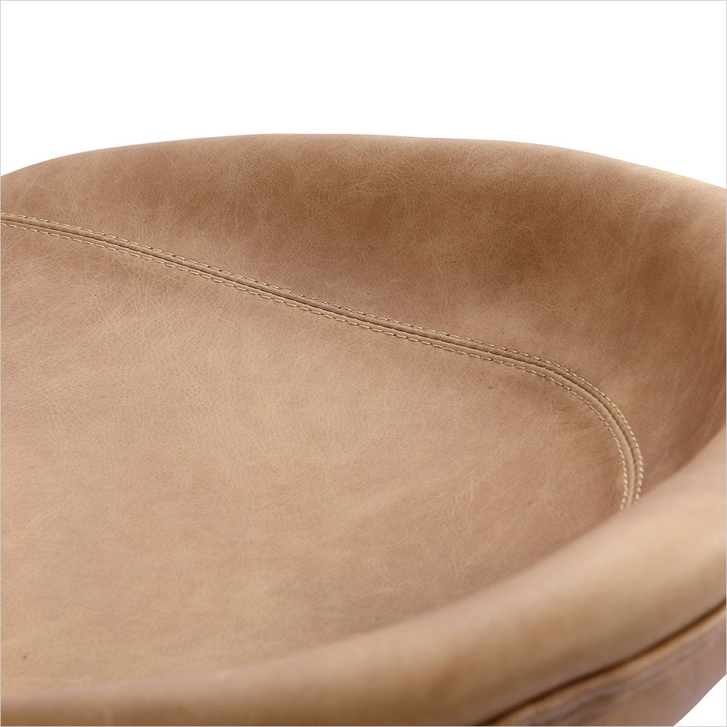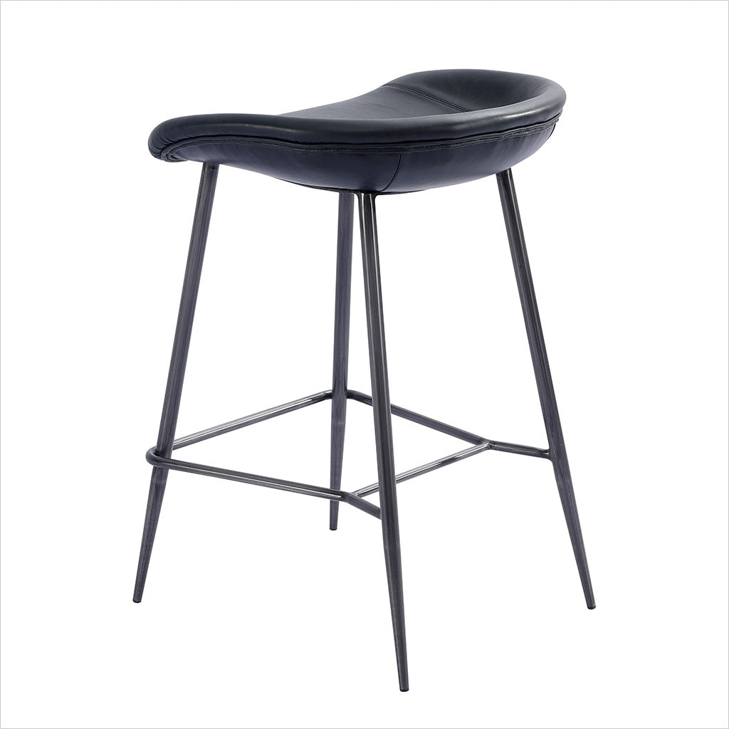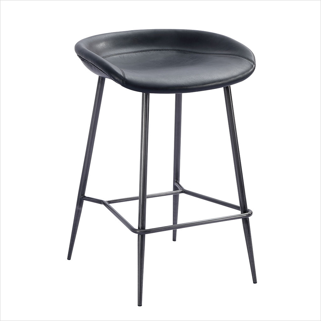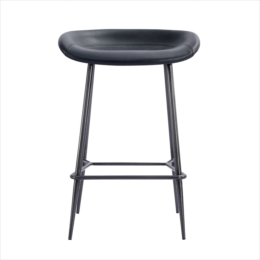 Le tabouret de bar Francisco est doté d'une assise sculptée et profilée pour plus de confort, avec des pieds fuselés en bronze. Disponible en cuir Congac ou noir.