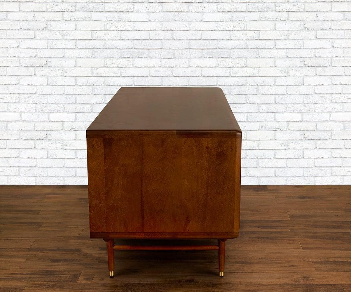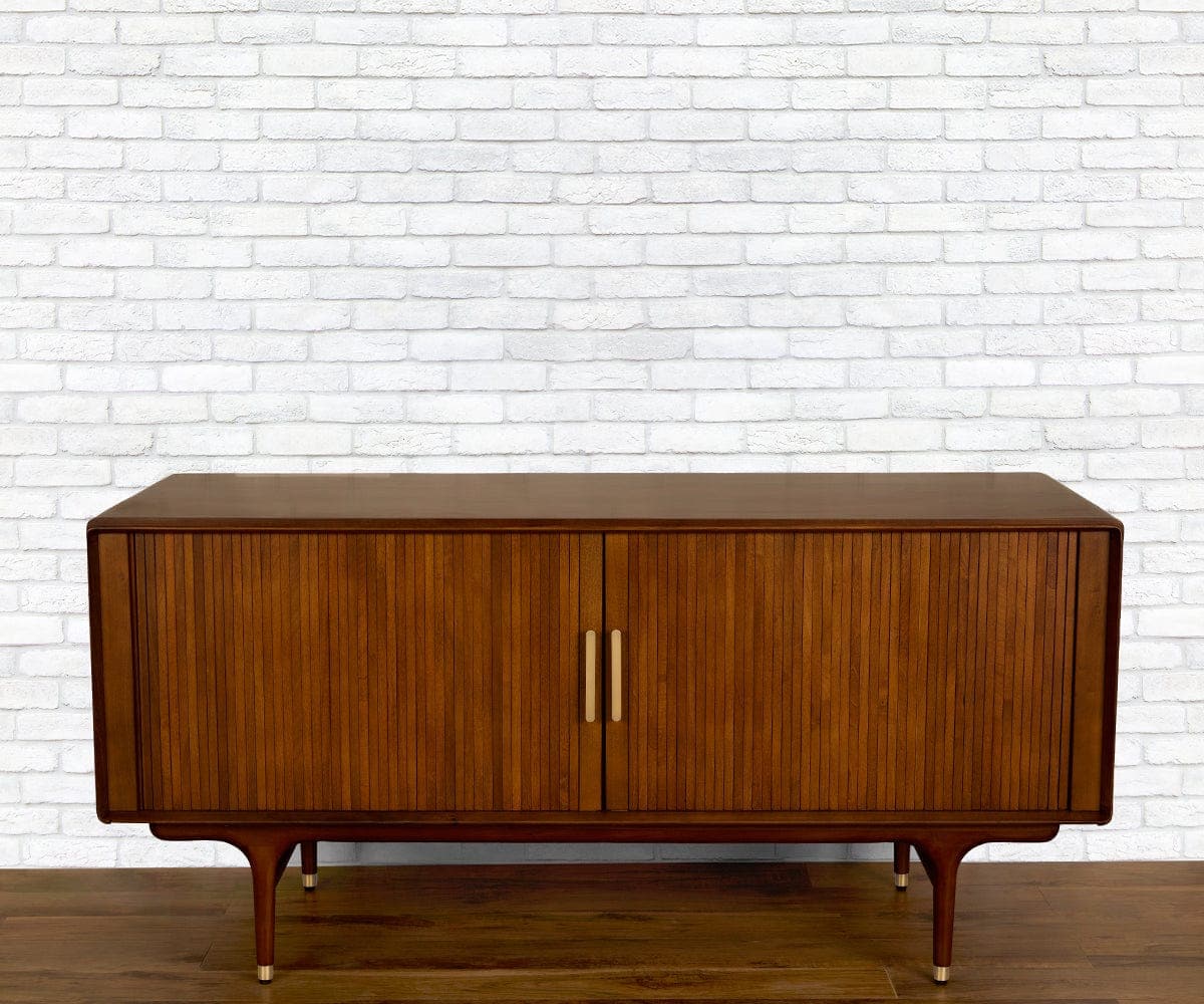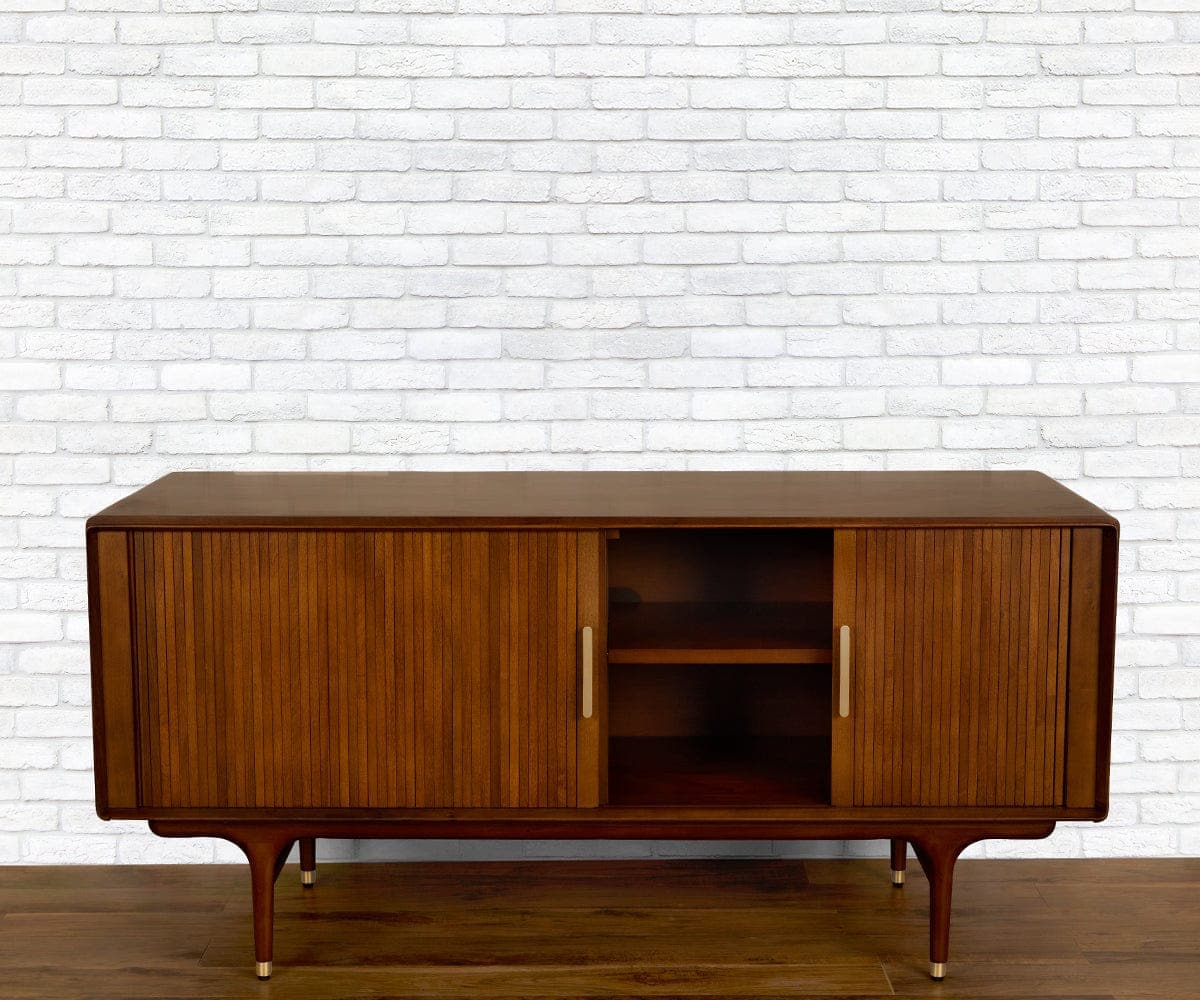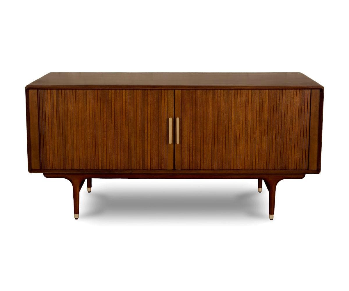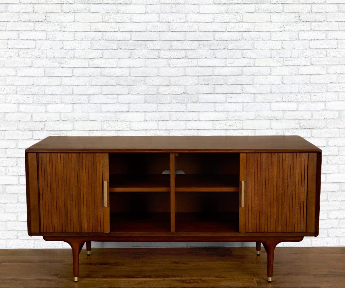 Le meuble multimédia Hendrick attire tous les regards grâce à son profil dynamique d'inspiration milieu du siècle. Il est équipé de deux portes à tambour pour tous vos besoins de rangement multimédia. Ces portes à tambour sont constituées de fines lattes qui coulissent latéralement pour révéler les spacieux placards intérieurs, équipés d'étagères réglables pratiques. Chaque tiroir est monté sur glissières à billes métalliques à extension complète pour un accès facile et fluide. Les pieds hauts et fuselés sont dotés de capuchons en laiton massif pour plus de durabilité et d'élégance. Les poignées de tiroir et de porte en laiton massif complètent l'esthétique.