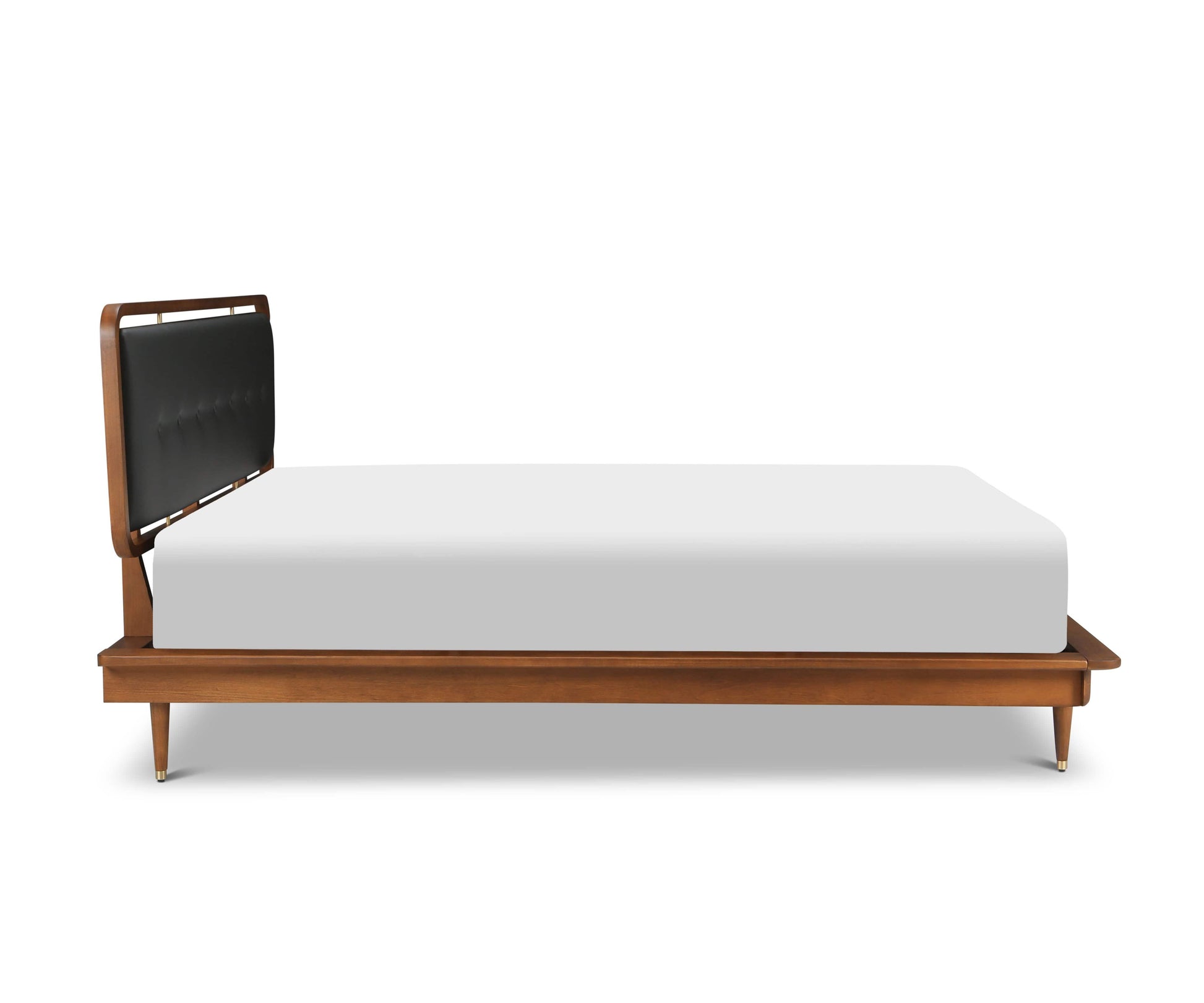 Dormez avec style grâce au lit Hendrick. Fabriqué en peuplier américain massif, son cadre robuste s'inspire des designs intemporels du milieu du siècle, avec ses lignes épurées et ses pieds hauts et fuselés. Le revêtement en similicuir noir capitonné de la tête de lit lui confère une touche moderne et audacieuse. Les finitions et les embouts de pieds en laiton massif complètent ce style sophistiqué.