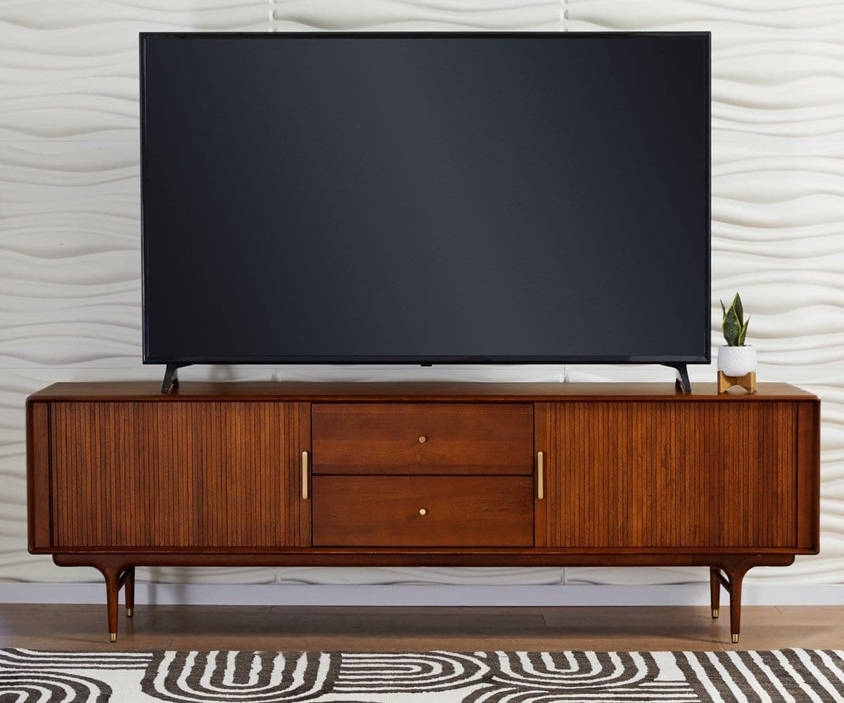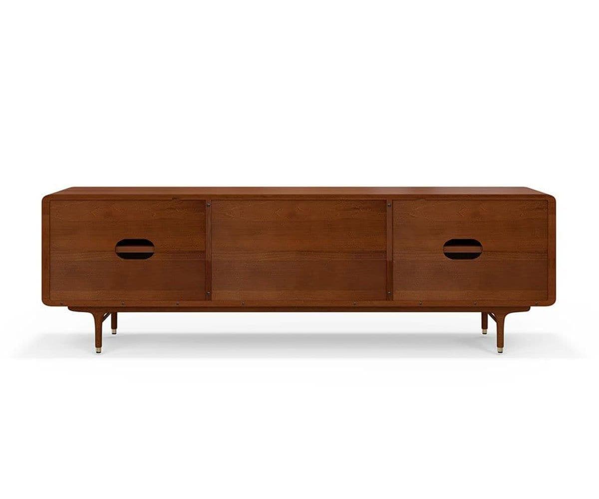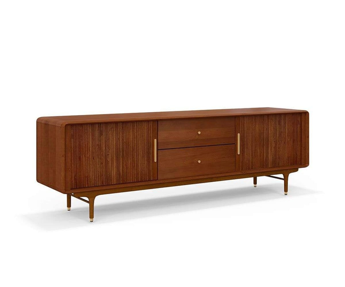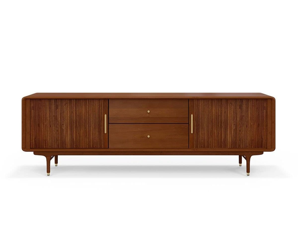 Le meuble multimédia Hendrick attire tous les regards grâce à son profil dynamique d'inspiration milieu de siècle. Ce meuble rectangulaire et long offre deux grands tiroirs et deux portes à rideau pour tous vos besoins de rangement multimédia. Ces portes à rideau sont constituées de fines lattes qui coulissent latéralement pour révéler les spacieux placards intérieurs, agrémentés d'étagères pratiques. Chaque tiroir est monté sur glissières à billes métalliques à extension complète pour un accès facile et fluide. Les pieds hauts et fuselés sont dotés de capuchons en laiton massif pour plus de durabilité et d'élégance. Les poignées de tiroir et de porte en laiton massif complètent l'esthétique.