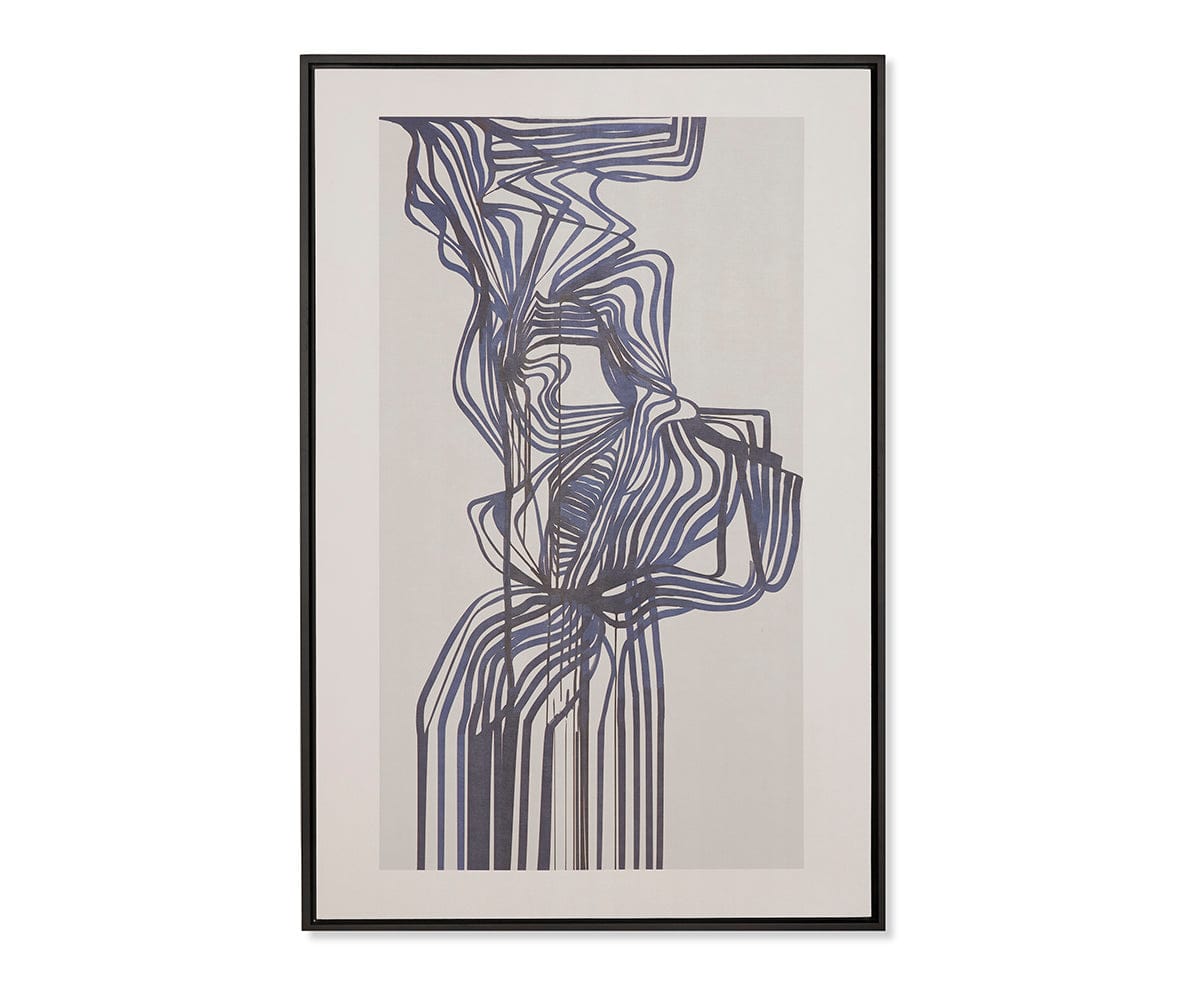 Imprimé en haute définition sur toile, Lemus présente un motif indigo abstrait, élégamment encadré dans du bois peint en noir.
