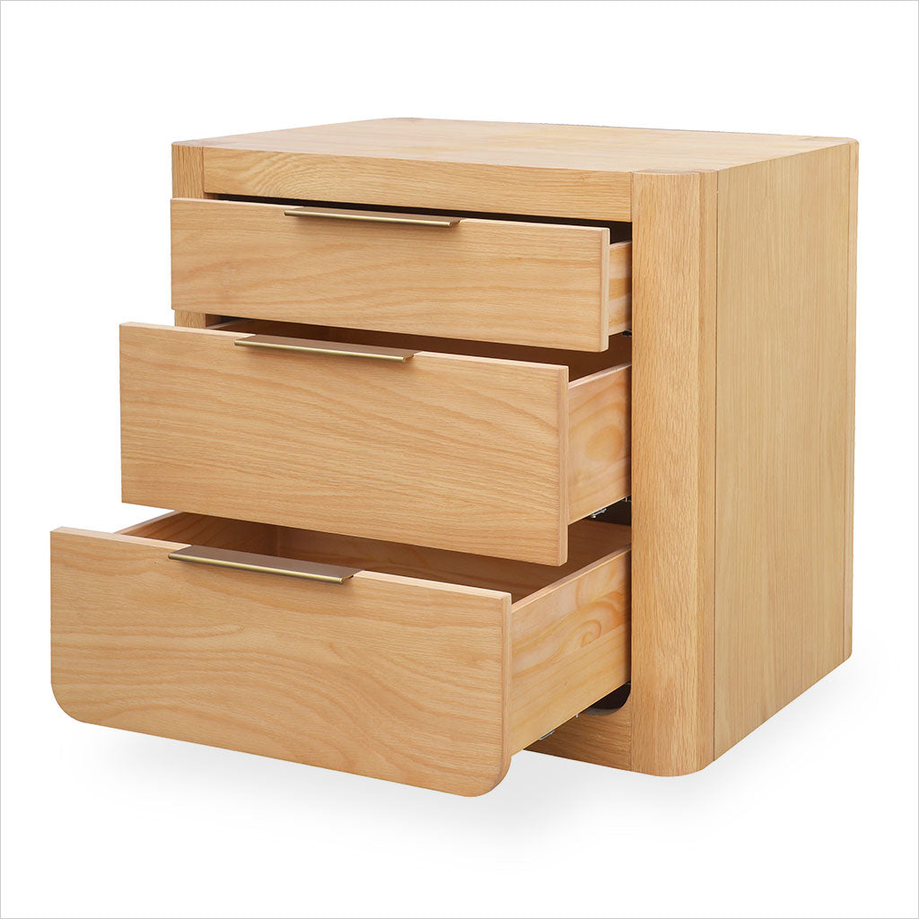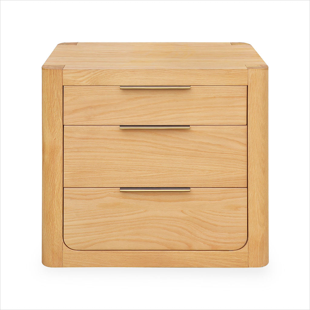 Cette table de chevet Luna, en chêne blanc français, est idéale comme table de chevet. Elle dispose de trois tiroirs, dont un tiroir supérieur doublé de tissu, offrant un vaste espace de rangement. Ses bords arrondis lui confèrent une douceur contemporaine, ainsi que d'élégantes poignées en métal doré.