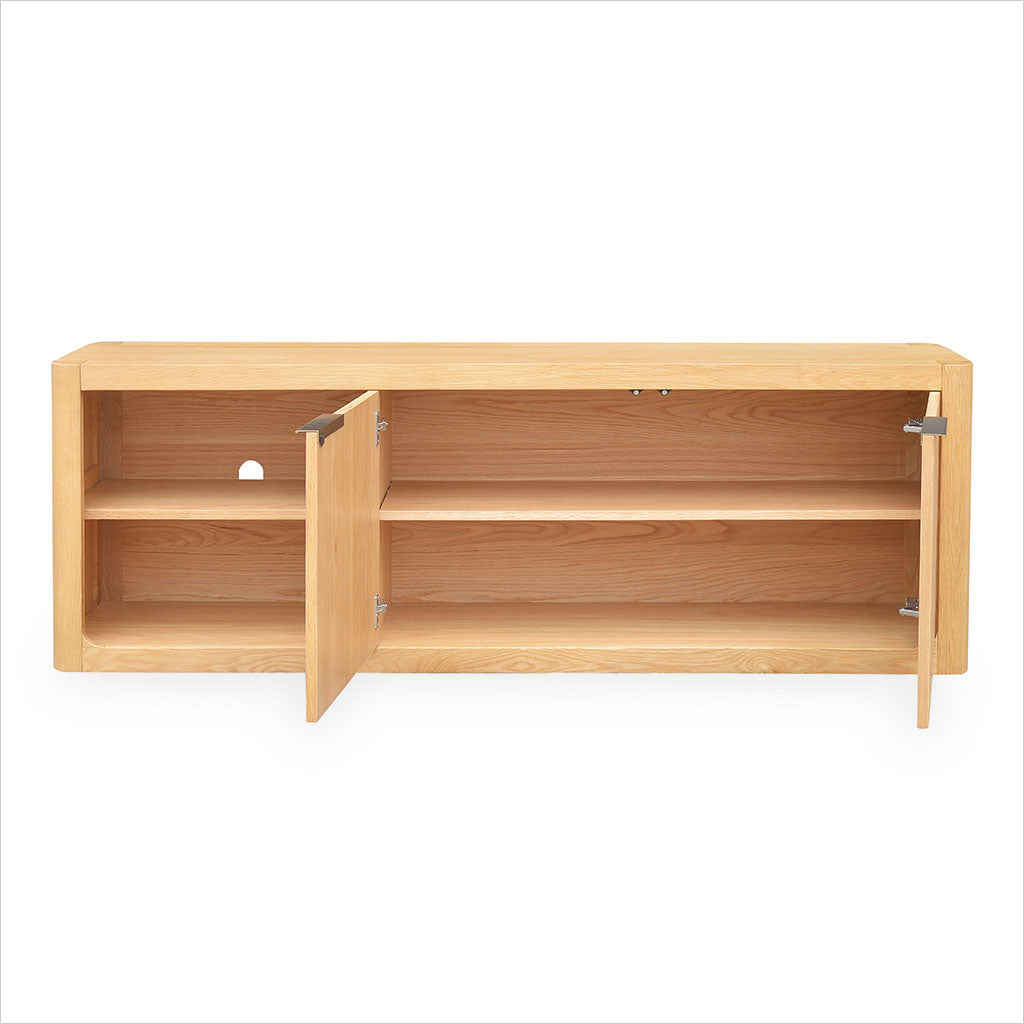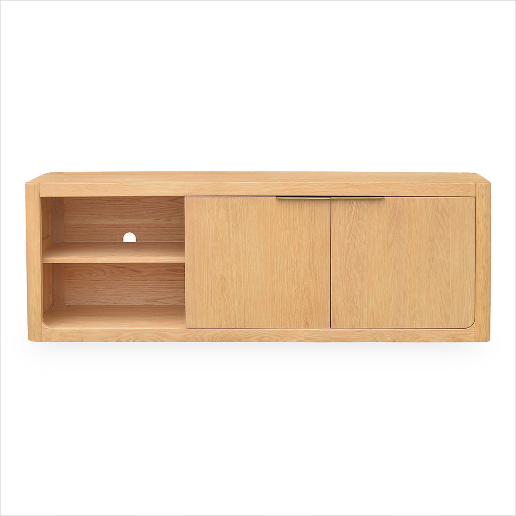 Le meuble multimédia Luna se distingue par son superbe bois de chêne et ses bords arrondis. Les meubles offrent de nombreux rangements, ainsi que des étagères réglables et des passe-câbles audio-vidéo. Un meuble trois portes plus grand et des tables d'appoint sont également disponibles.