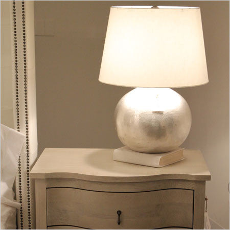 La base sphérique en fer de la lampe de table Menton est dotée d'une finition argent métallisé mat. Surmontée d'un élégant abat-jour en lin blanc, cette lampe dégage une esthétique sculpturale et épurée. À associer à la suspension en fer Menton.