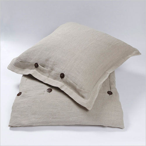 Ensemble de literie en lin naturel et coton, détaillé avec bouton en bois.