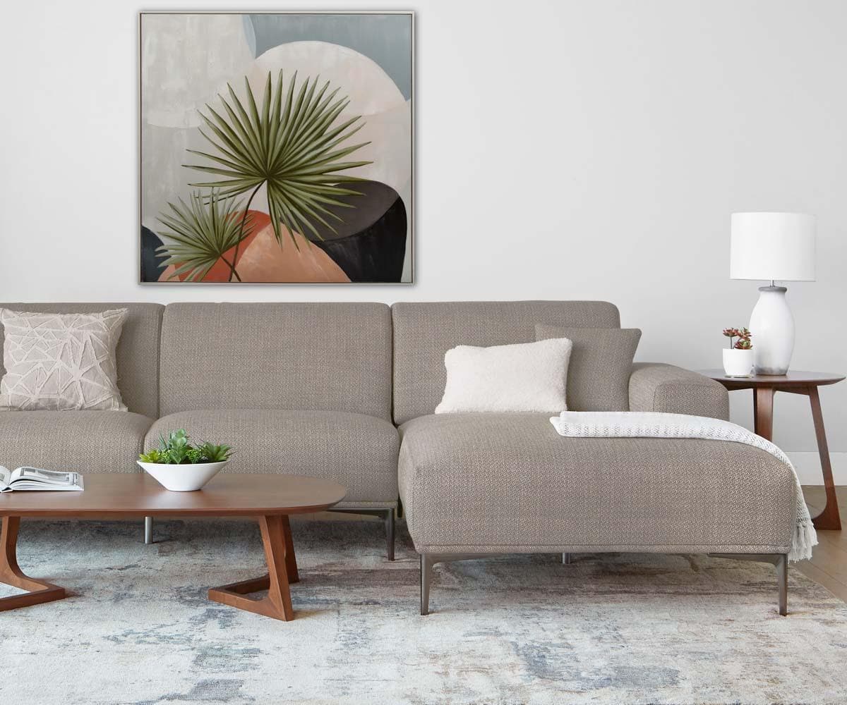 La peinture à l'huile « Fleurs au clair de lune » évoque l'essence même des douces nuits de pleine lune. Appréciant l'ambiance insulaire avec modernité et géométrie, cette œuvre est peinte à la main, entièrement à l'huile sur toile. Sa palette moderne du milieu du siècle est sublimée par un cadre blanc aérien qui s'harmonise parfaitement avec les tons clairs du tableau. Deux feuilles de palmier feuillues trônent fièrement au premier plan, tandis que de jolies formes organiques habillent l'arrière-plan. Facilement assortie aux autres peintures à l'huile « Lune au clair de lune », cette pièce maîtresse de la collection trouvera parfaitement sa place dans une galerie murale artistique, entourée des plus petites. Elle peut également être accrochée sur un mur opposé pour évoquer l'ambiance tropicale de la collection de peintures à l'huile « Lune au clair de lune ».