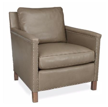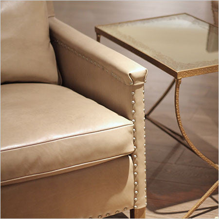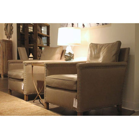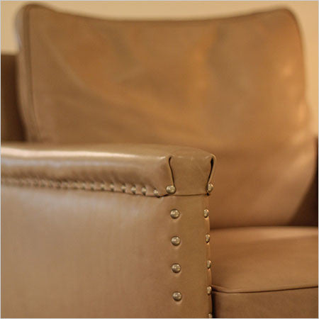 Chaise Ollie en cuir avec petite garniture cloutée et coussin standard. Disponible en Summit Fennel, mais disponible dans de nombreux autres tissus et cuirs sur commande spéciale.