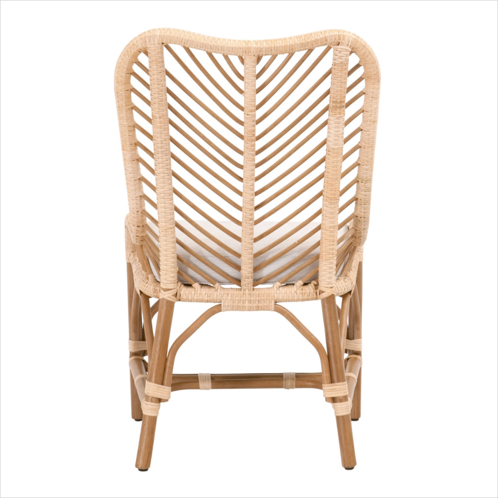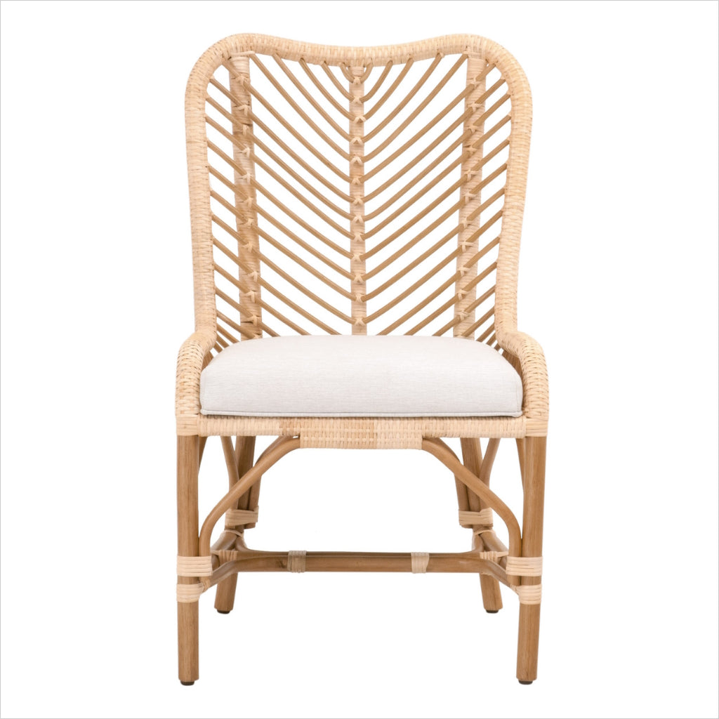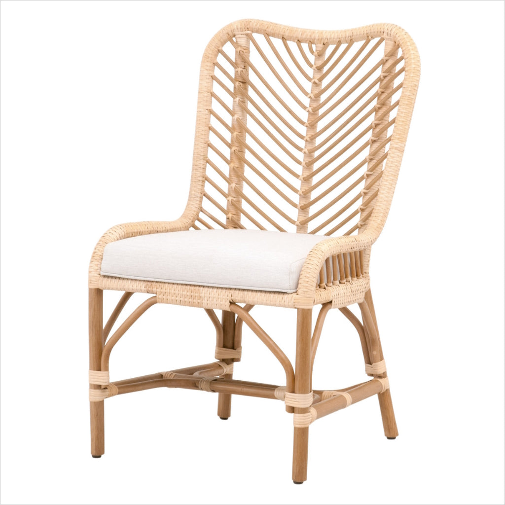 La chaise Pacific présente un design léger et ludique, riche en textures. Son rotin naturel tissé à la main présente un motif à chevrons. Le coussin d'assise est recouvert d'un tissu doux et performant, résistant aux éclaboussures et aux taches, pour un nettoyage facile.