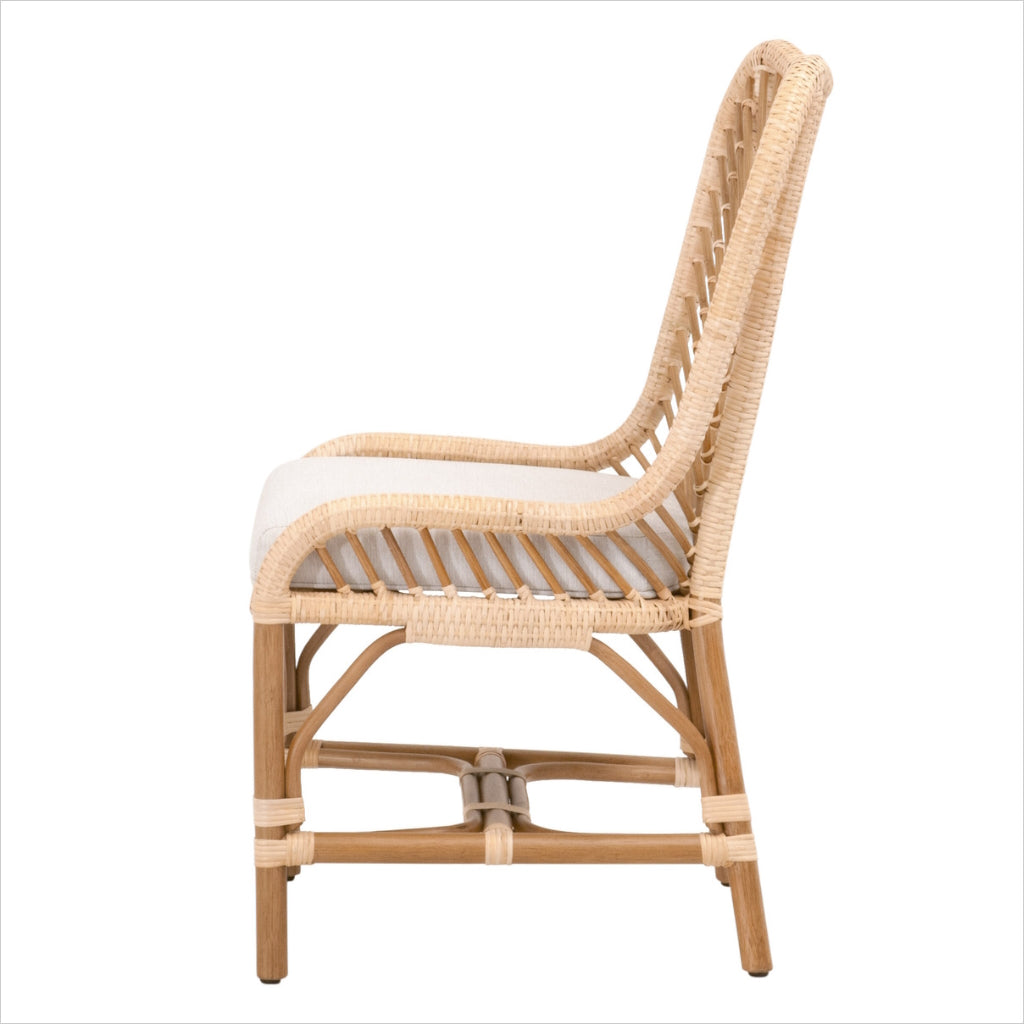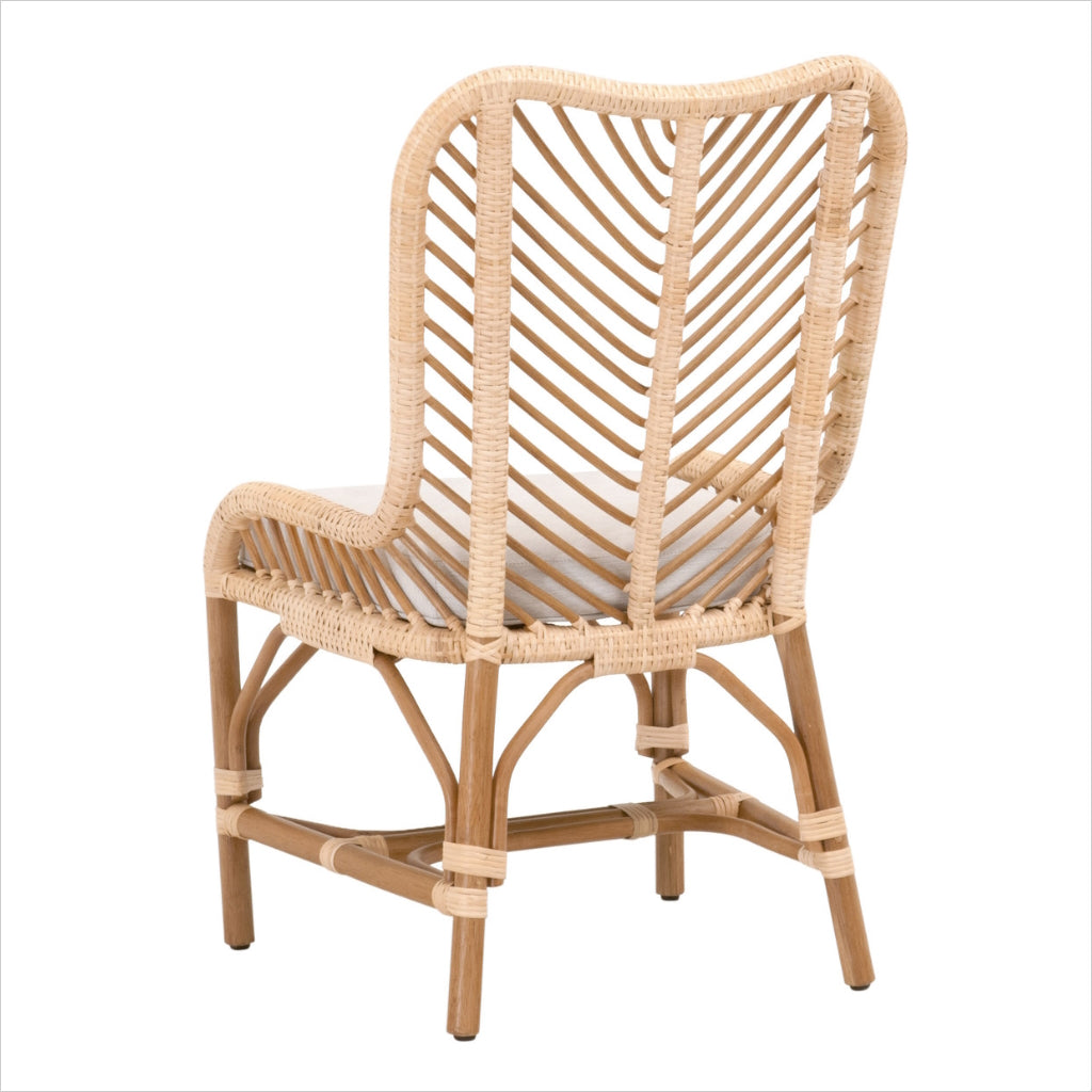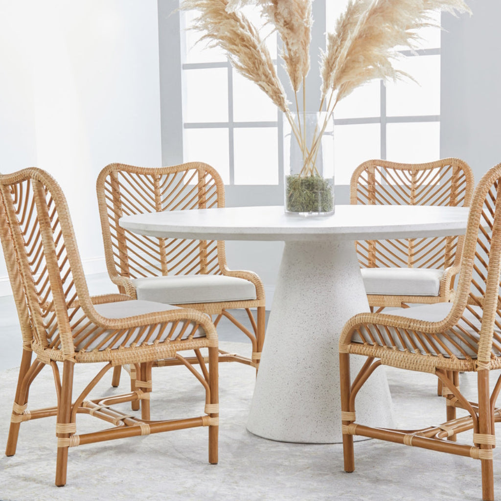 La chaise Pacific présente un design léger et ludique, riche en textures. Son rotin naturel tissé à la main présente un motif à chevrons. Le coussin d'assise est recouvert d'un tissu doux et performant, résistant aux éclaboussures et aux taches, pour un nettoyage facile.