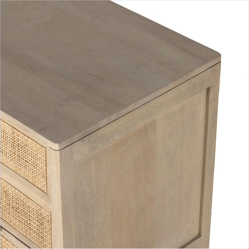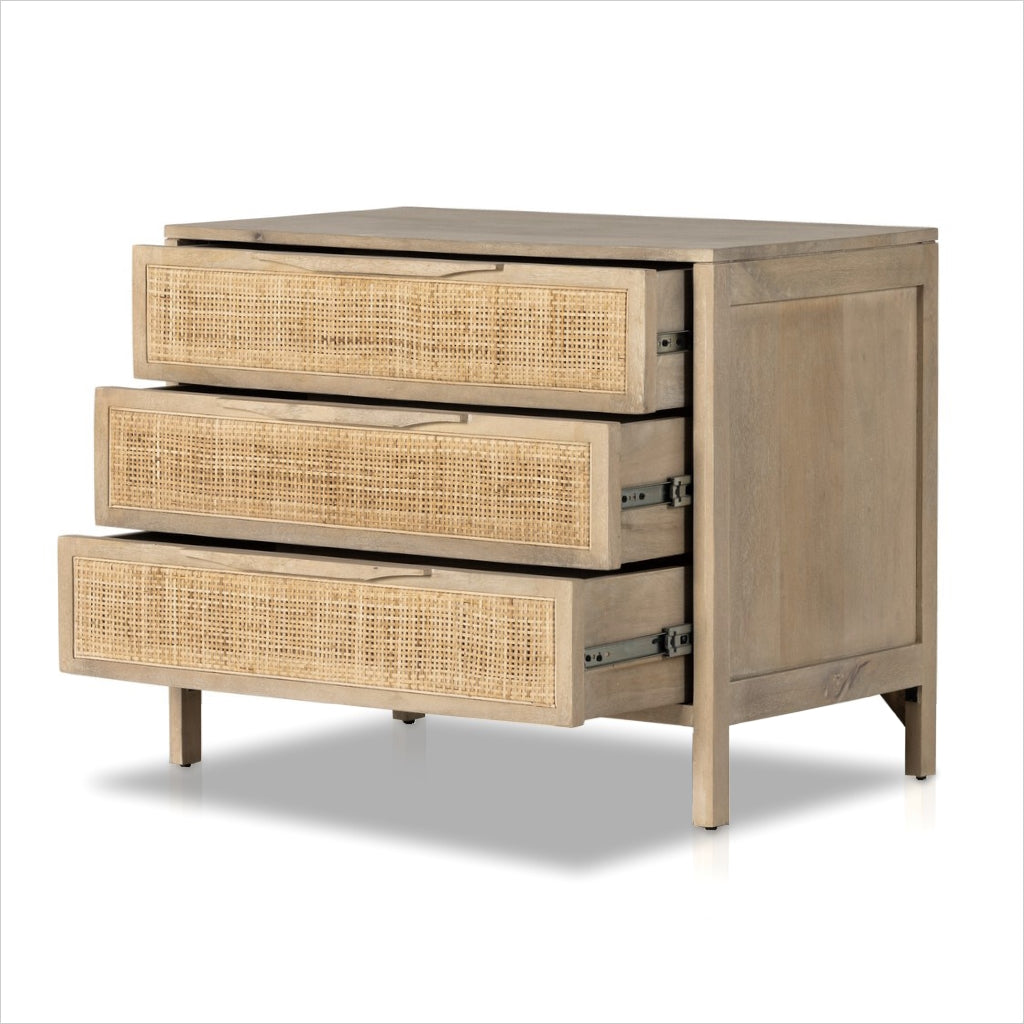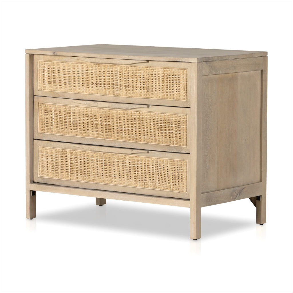 La table de chevet Palm, fabriquée en manguier naturel, est dotée de trois tiroirs aux dimensions généreuses, empreints d'une touche classique du milieu du siècle. Les façades sophistiquées des tiroirs sont ornées de rotin naturel finement tressé, ajoutant une touche de texture au design. Disponible sur commande spéciale en manguier lavé noir avec tiroirs en rotin naturel.