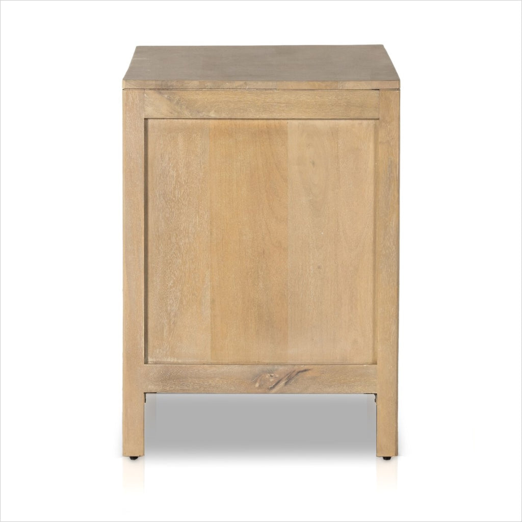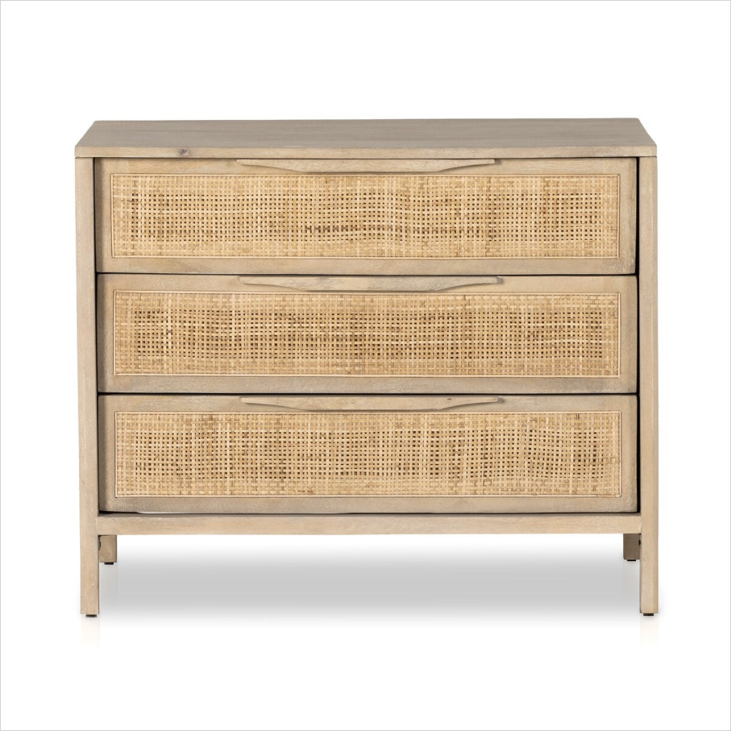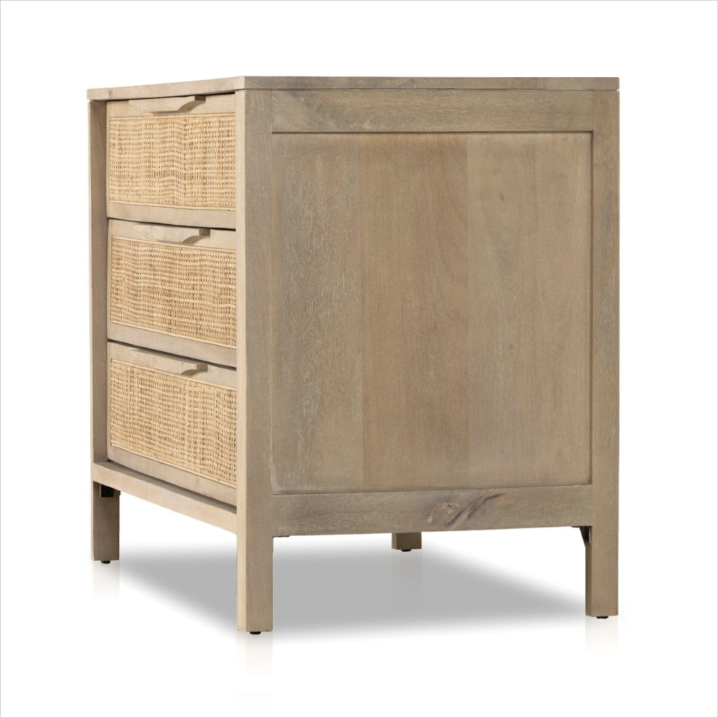 La table de chevet Palm, fabriquée en manguier naturel, est dotée de trois tiroirs aux dimensions généreuses, empreints d'une touche classique du milieu du siècle. Les façades sophistiquées des tiroirs sont ornées de rotin naturel finement tressé, ajoutant une touche de texture au design. Disponible sur commande spéciale en manguier lavé noir avec tiroirs en rotin naturel.