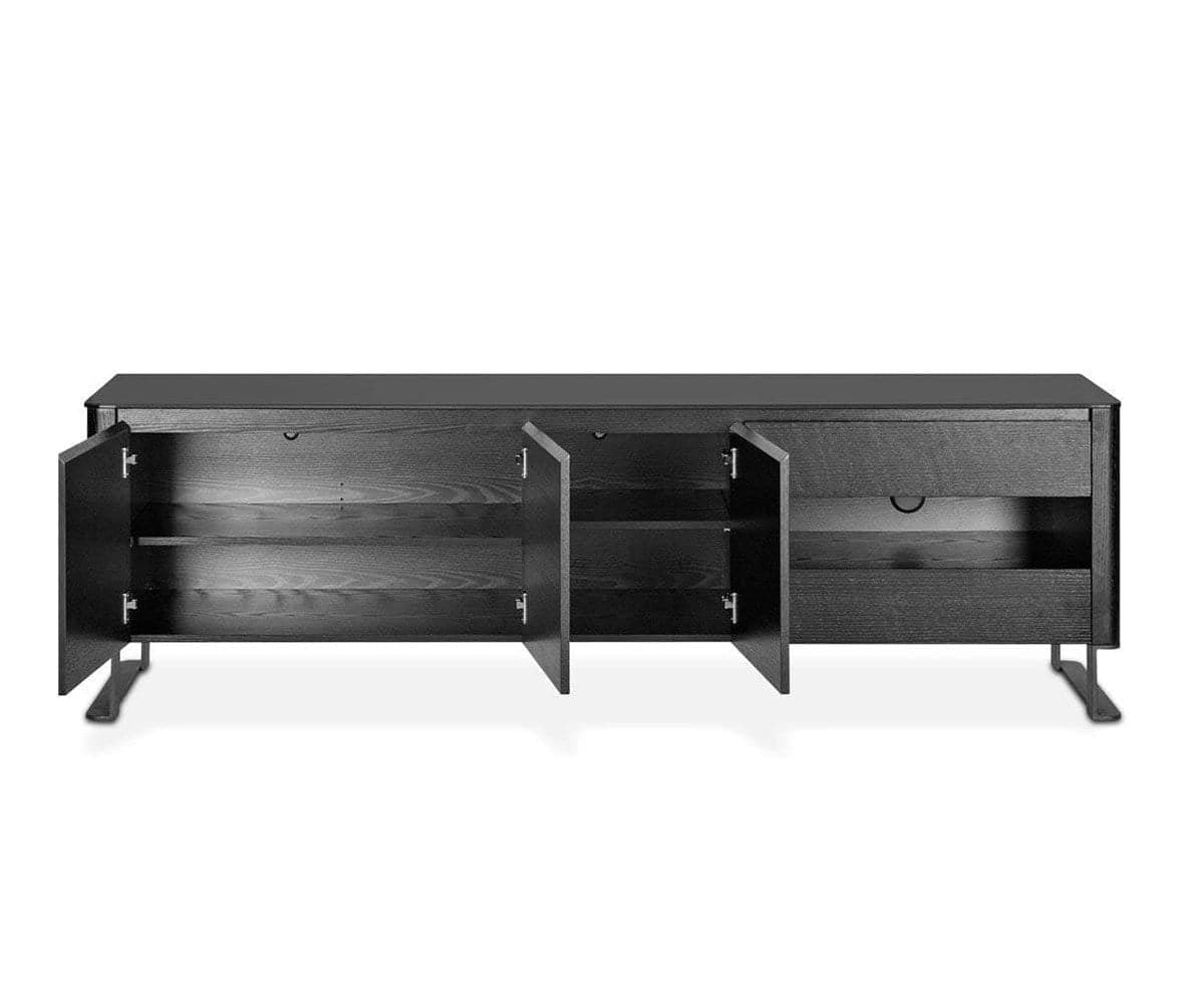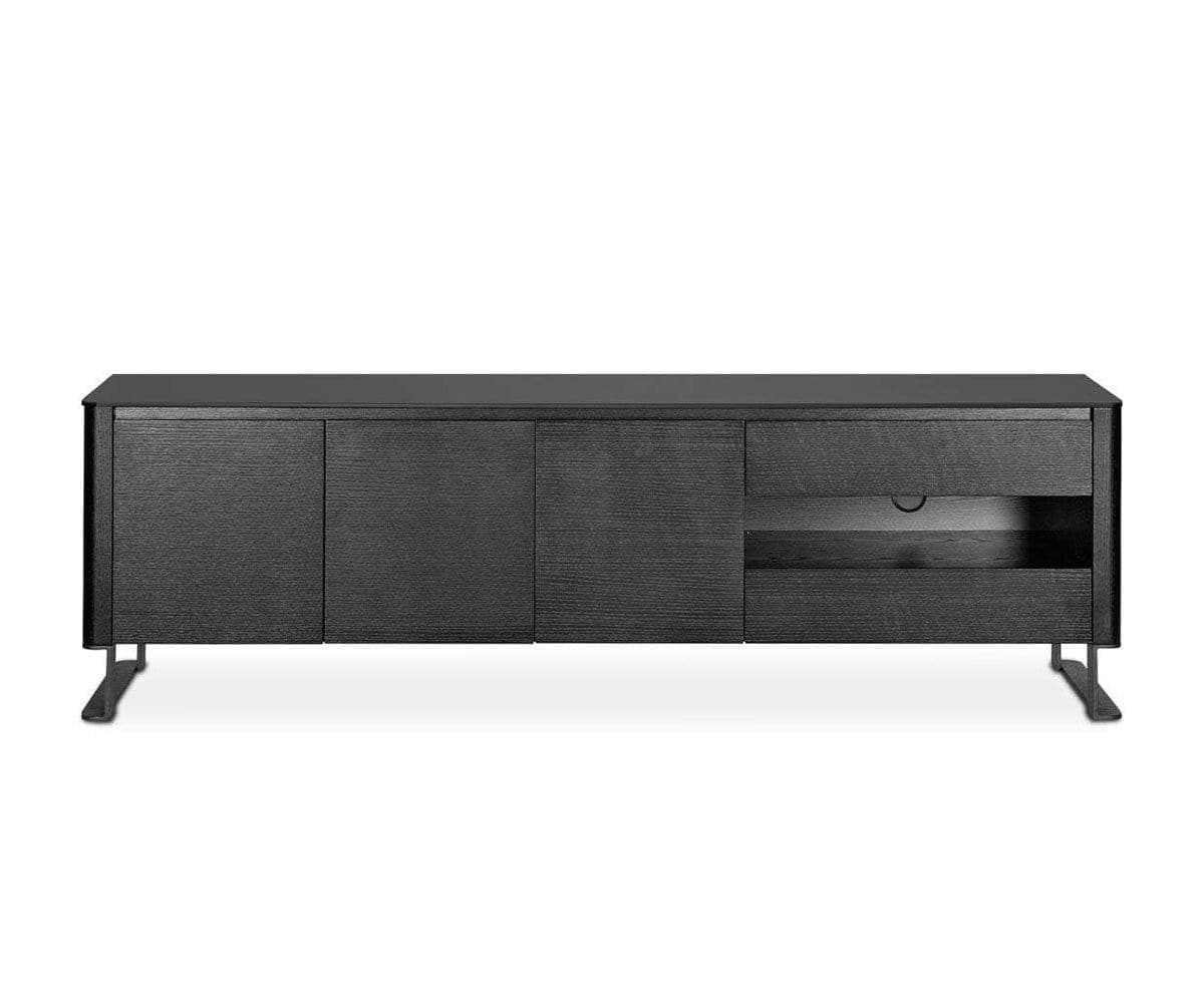 Épuré et dynamique, le meuble multimédia Pritz offre une polyvalence remarquable. Ce meuble masculin est surélevé par des pieds modernes, créant un effet flottant. Deux petits tiroirs, une niche ouverte et trois armoires offrent un espace de rangement généreux pour tous vos supports multimédias.