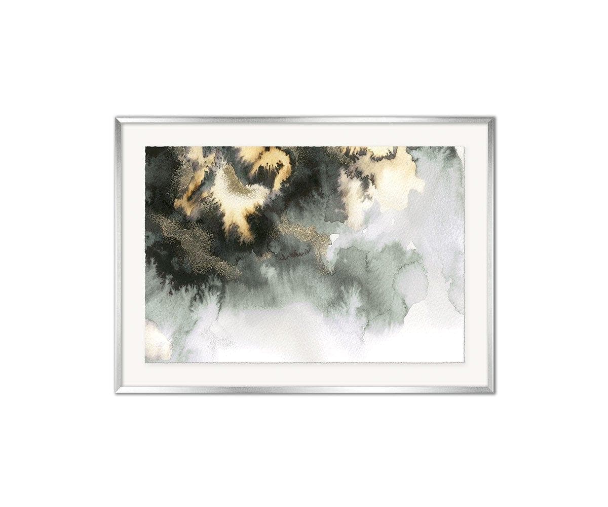 L'affiche encadrée « Marées Montantes » apporte une touche de glamour abstrait à n'importe quelle pièce. Un contraste saisissant de tons clairs et foncés est rehaussé de nuances apaisantes de vert écume et d'or éclatant, évoquant l'océan déchaîné après une tempête. Exposez cette œuvre chez vous pour une touche d'élégance contemporaine indéniable.