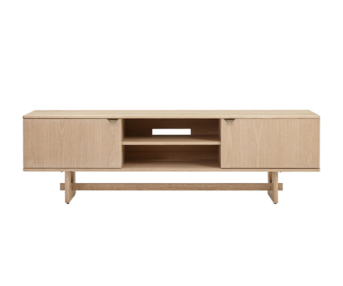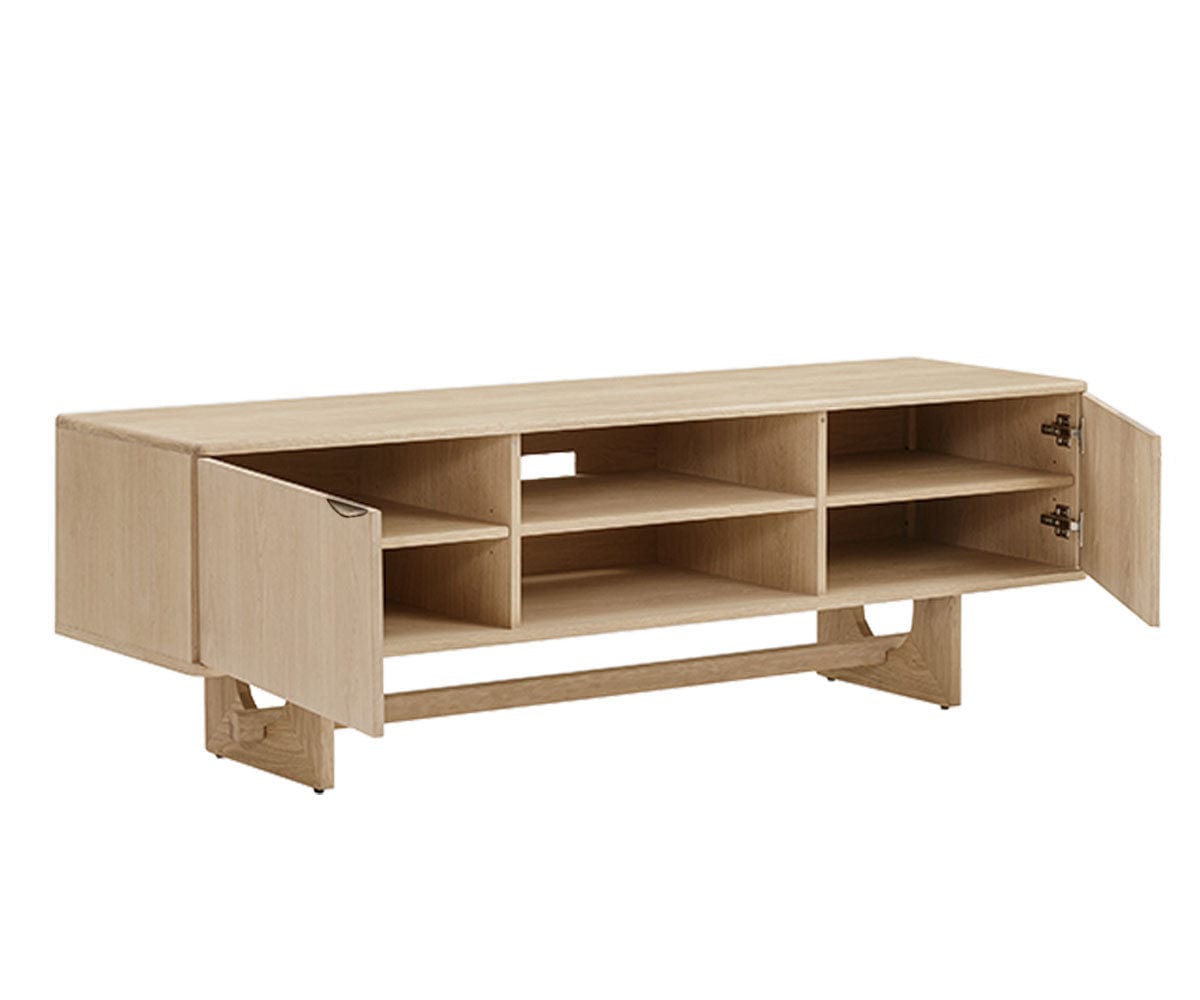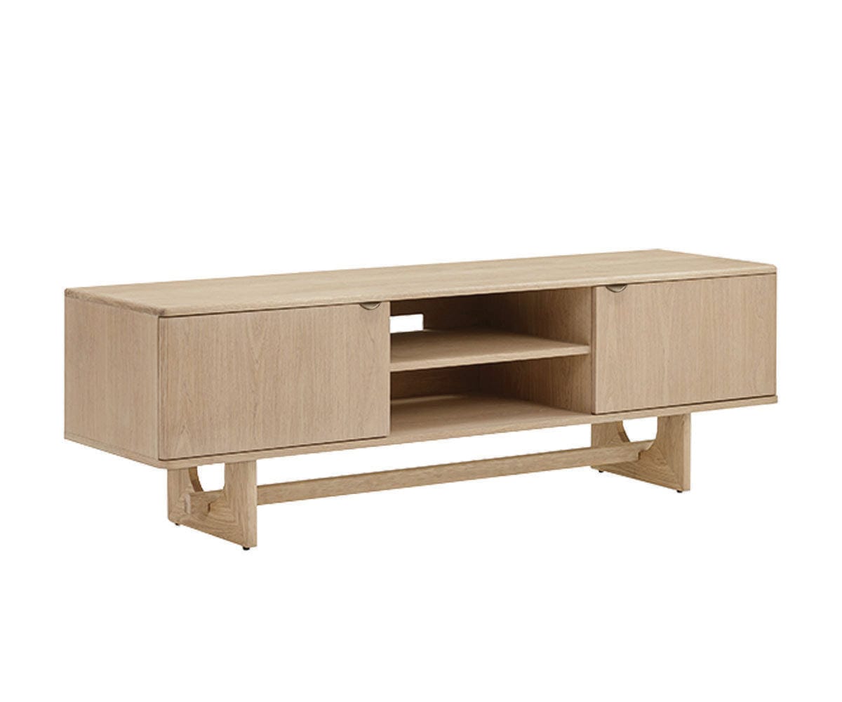 Le meuble multimédia Unni apportera une touche d'élégance Mid-Century à votre espace grâce à sa base en chêne massif arquée et son placage en chêne mat, rehaussés de quincaillerie en métal brossé. Il dispose de deux grands rangements, chacun équipé d'étagères et de portes, tandis que la partie centrale ouverte et facile d'accès est dotée d'un passe-câbles à l'arrière. Associez ce meuble multimédia aux autres meubles de la collection Unni pour un ensemble harmonieux qui s'intègre harmonieusement à presque tous les styles de décoration.