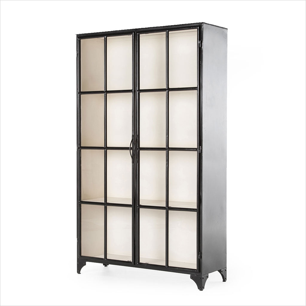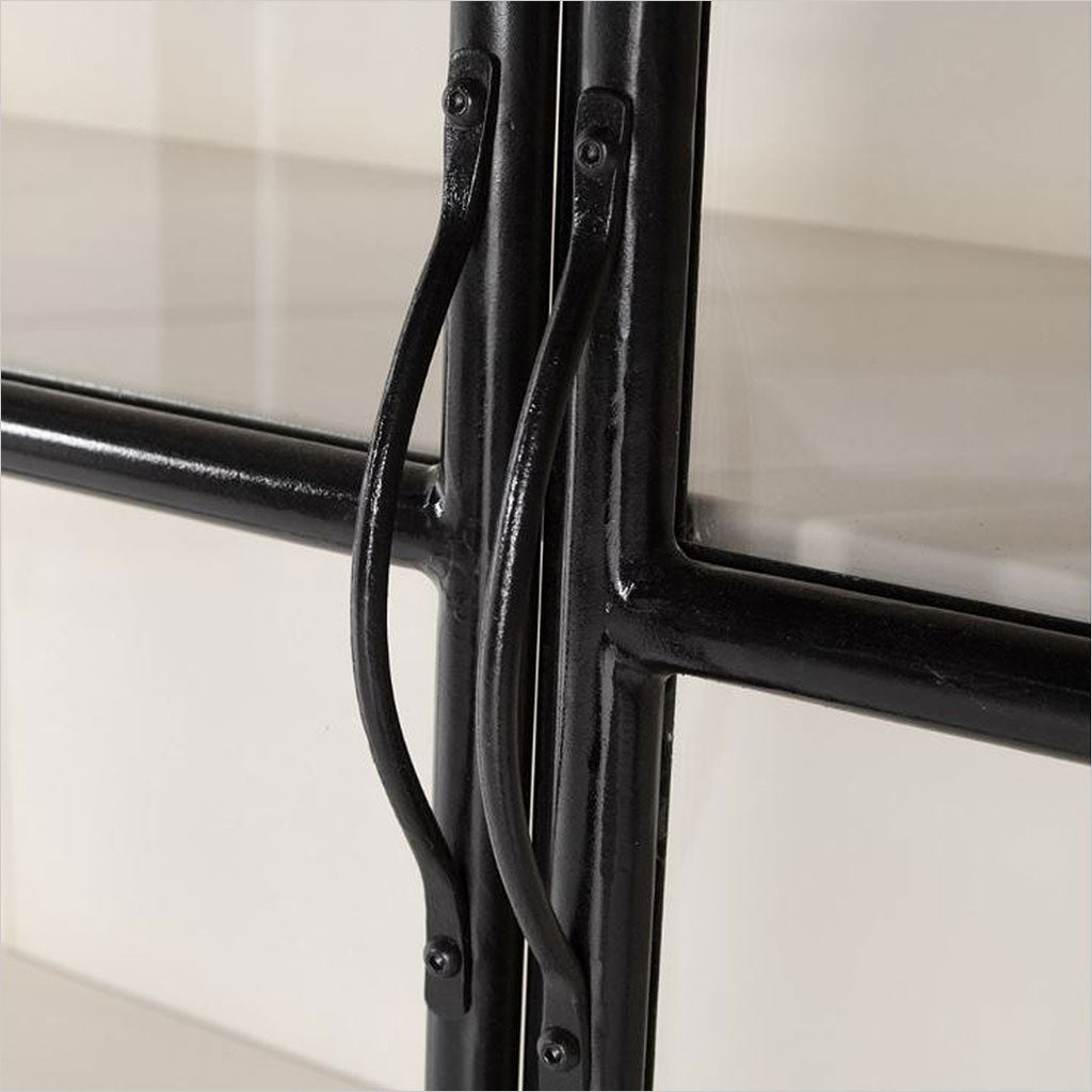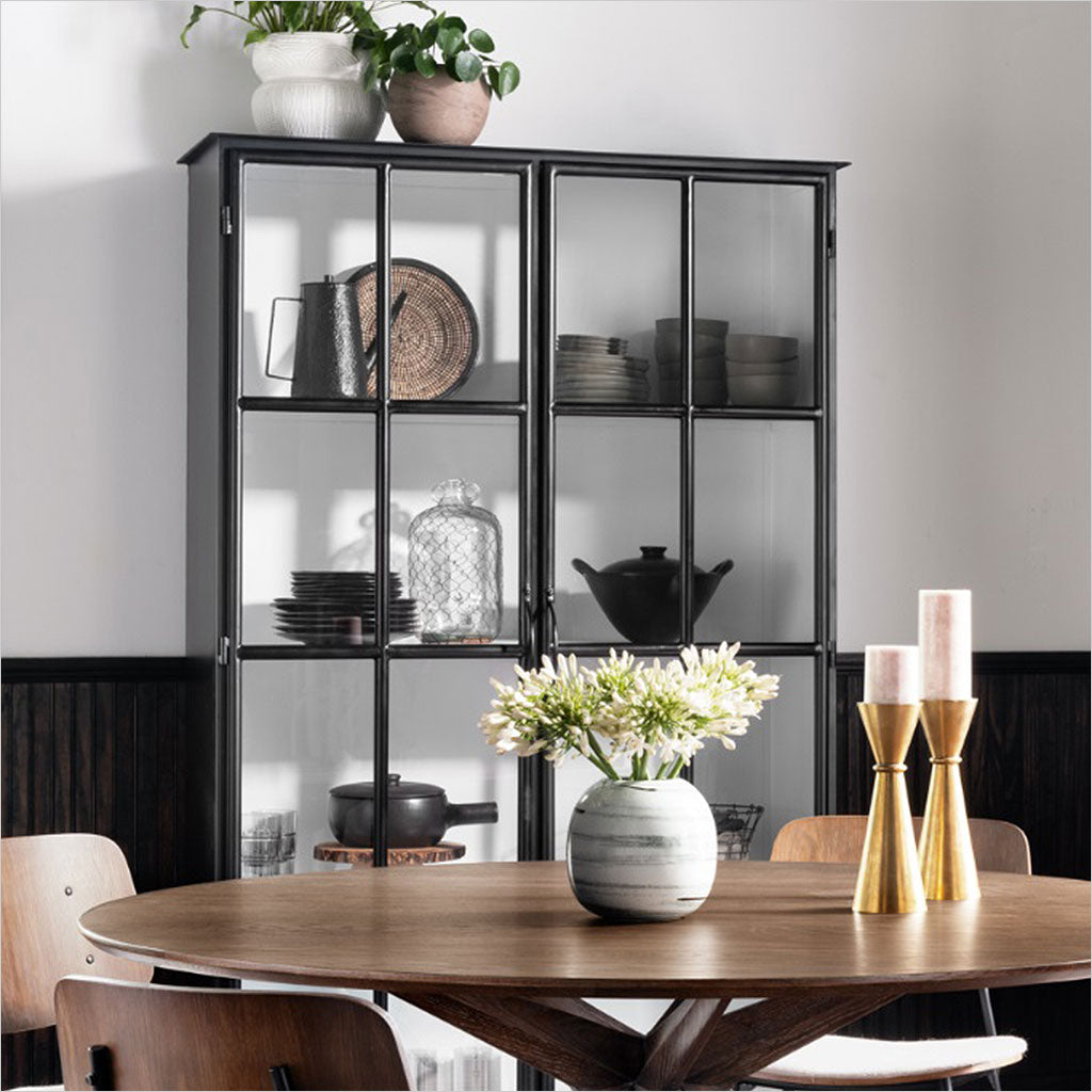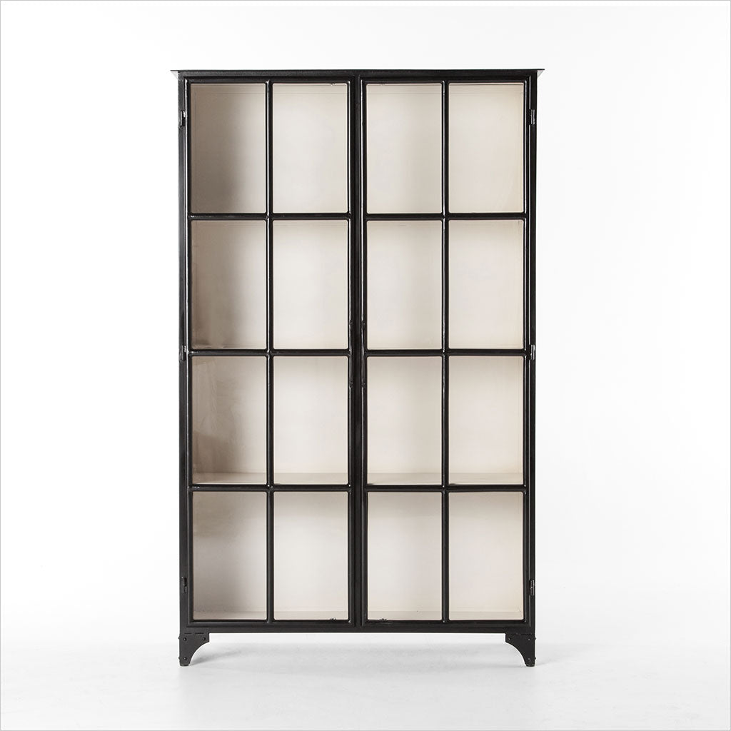 La vitrine Webster présente une structure en fer noir rappelant le passé, avec des fenêtres à double battant. L'intérieur blanc offre un cadre saisissant pour vos expositions.